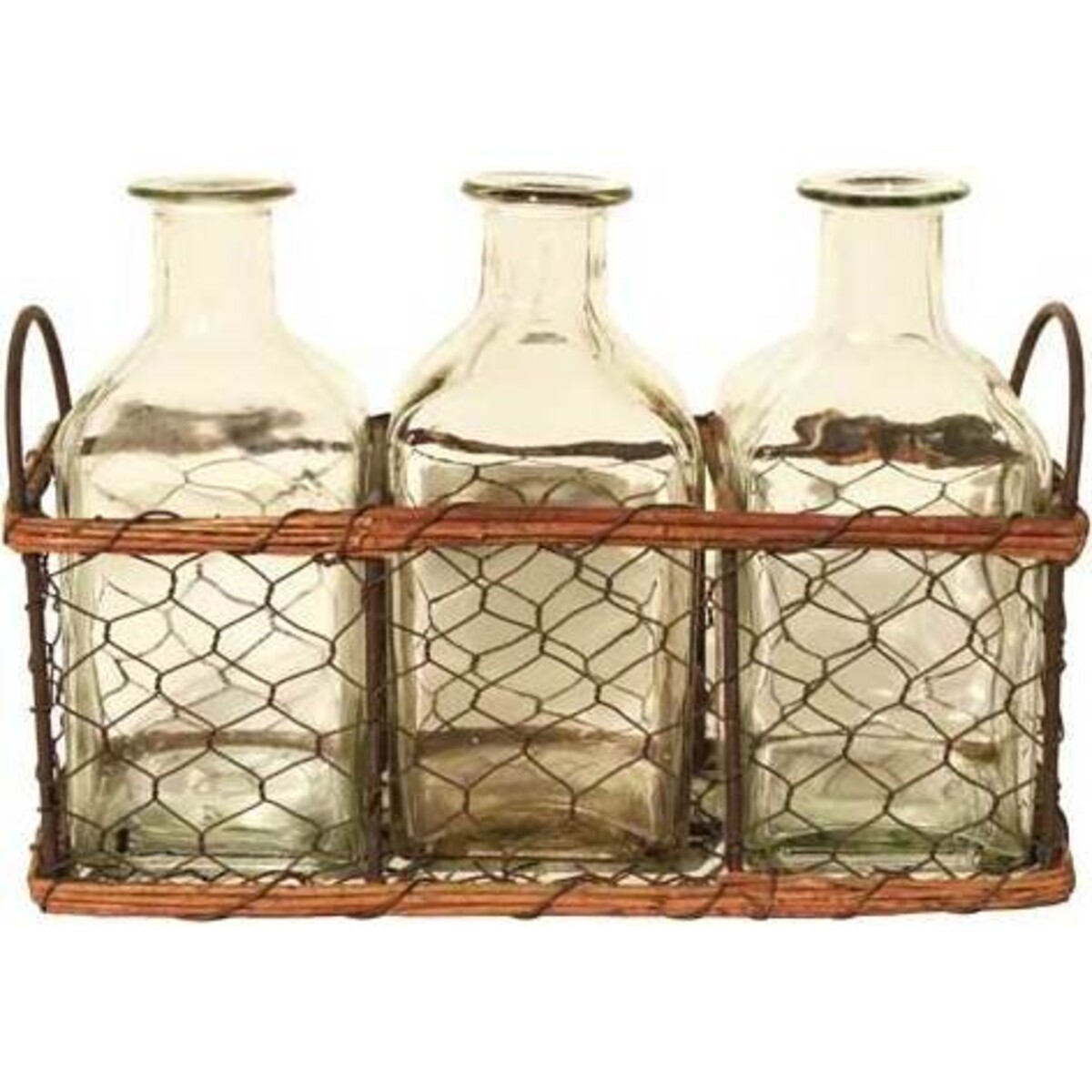 These Mini Bottles in Mesh Basket from LaVida are a subtle reminder of the daily milkman and a bygone era. A trio of glass mini bottles are presented in a tidy basket comprised of natural willow and chicken wire for a true taste of the country. The basket features a willow frame wrapped in wire and two attached metal handles for easy transport. This quaint home accent is an easy addition to any country - themed decor and would look right at home holding three bunches of wildflowers and displayed on a vintage kitchen table or in a sunny window.