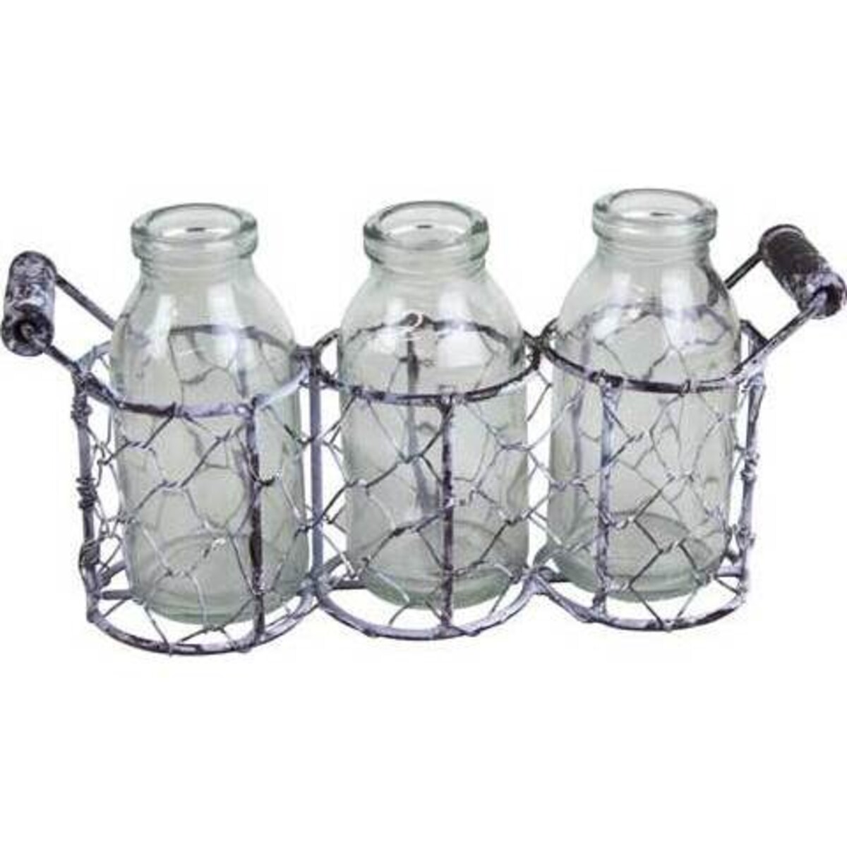 LaVida keeps three small milk - bottle type containers in line with its Mini Bottles Wire Line 3. This quaint home accent features a rustic metal and chicken wire basket with three separate compartments to hold three miniature glass bottles. Metal handles are attached to either side of the basket for easy placement. The metal and wire in the basket feature a dusty grey, distressed finish for an aged look and added vintage style. These bottles could be easily displayed empty but would exude even more rural charm if filled with three bunches of wildflowers or fresh - cut herbs from the garden.