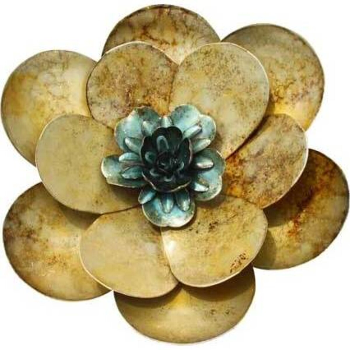 Variegated shades of gold over multiple layers of metal petals comprise the Mini Gold Flower from LaVida. The gold is accented with subtle hints of rust for an aged appearance. The metal flower is complemented with a center of bright blue petals, perfectly offsetting the gold. This wall decor piece measures 21 centimetres across and is one of several in a series of mini metals flowers from LaVida. Perfectly fine as a stand - alone piece, this wall flower would also look perfect in groups of the same colour or paired with the other coloured flowers in the series.