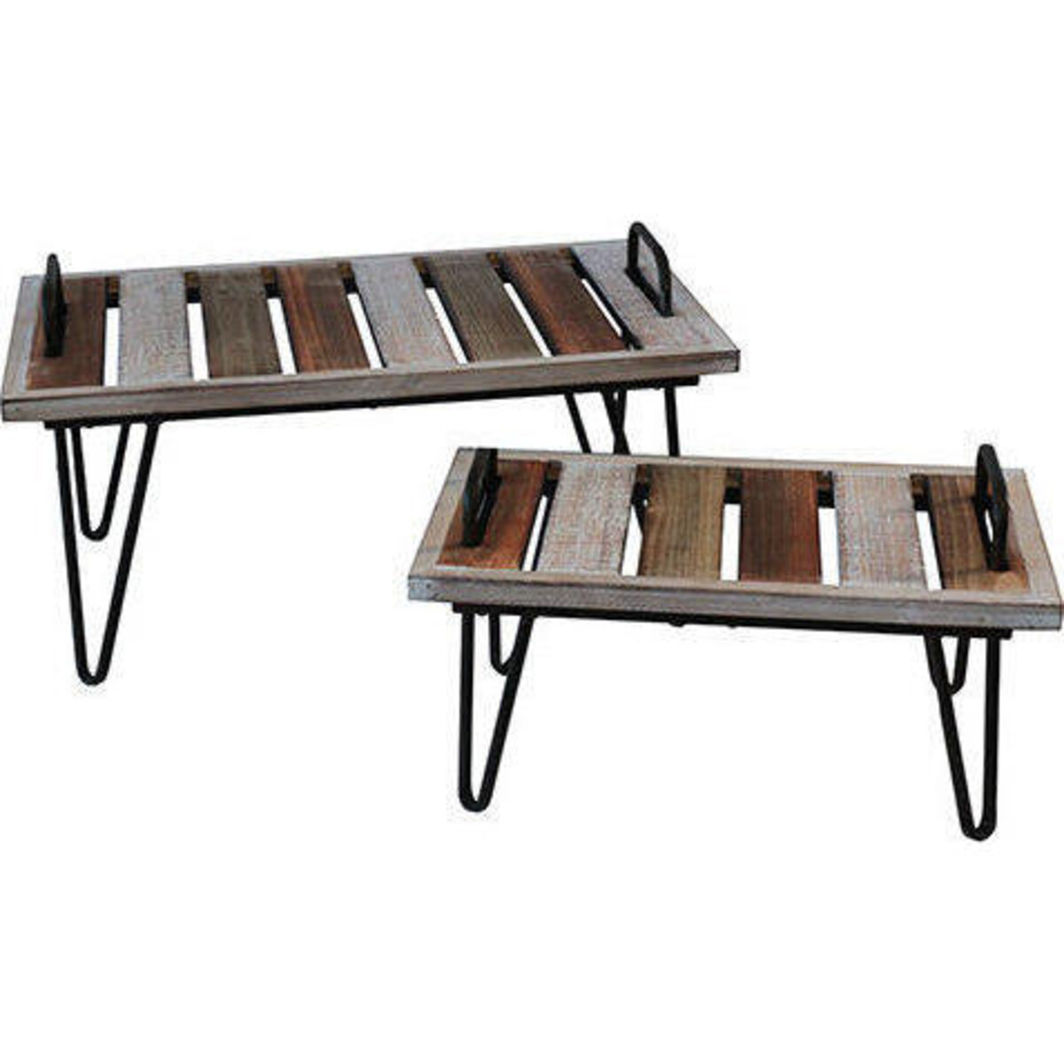 The ideal combination of metal and wood building in sturdiness and adding the touch of shabby modern chic style. This set of tables conveniently proportioned at 21 cm height in the smaller one and 27 cm in height for the larger of the two. The length and width also make them as ideal side tables as much as for a layered table arrangement that adds more value to your seating. The table has solid meta made looped legs that add more stability to them. The manner in which the legs form the frame work of the larger structure of the table gives them a modern and contemporary feel albeit the shabby chic way - seen in its unpainted metal portion and its weathered tonal wood usage. A classic means to add more depth and style to your spaces, adding such tables can only be called delightfully urbane. Add such tables in your interiors and forget the space crunch you feel when a lamp or some superb curio needs to be displayed or the barbecue platter needs to be off loaded on to something sold and ready to take on the heat.