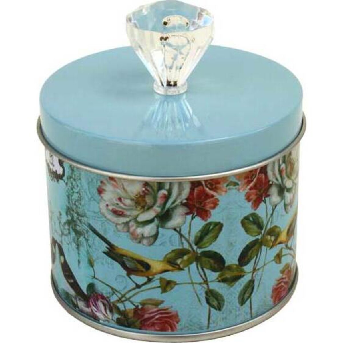 Mini Tin Blue Rose comprises of tin material and features flower - art decor done in green, red and white against a sky blue background. A beautiful knob lies at the centre - top of the lid. The storage - ware keeps food items ready for serving at the dining table for consumption. It is a lovely kitchen item to get as a gift for loved one or friend and can be set up beautifully on the outdoors when going on picnic or holding a garden tea party. The storage device remains usable for long owing to its durable tin form. It may be placed at a convenient location for guests to serve themselves or retained within the kitchen area for use by staff.