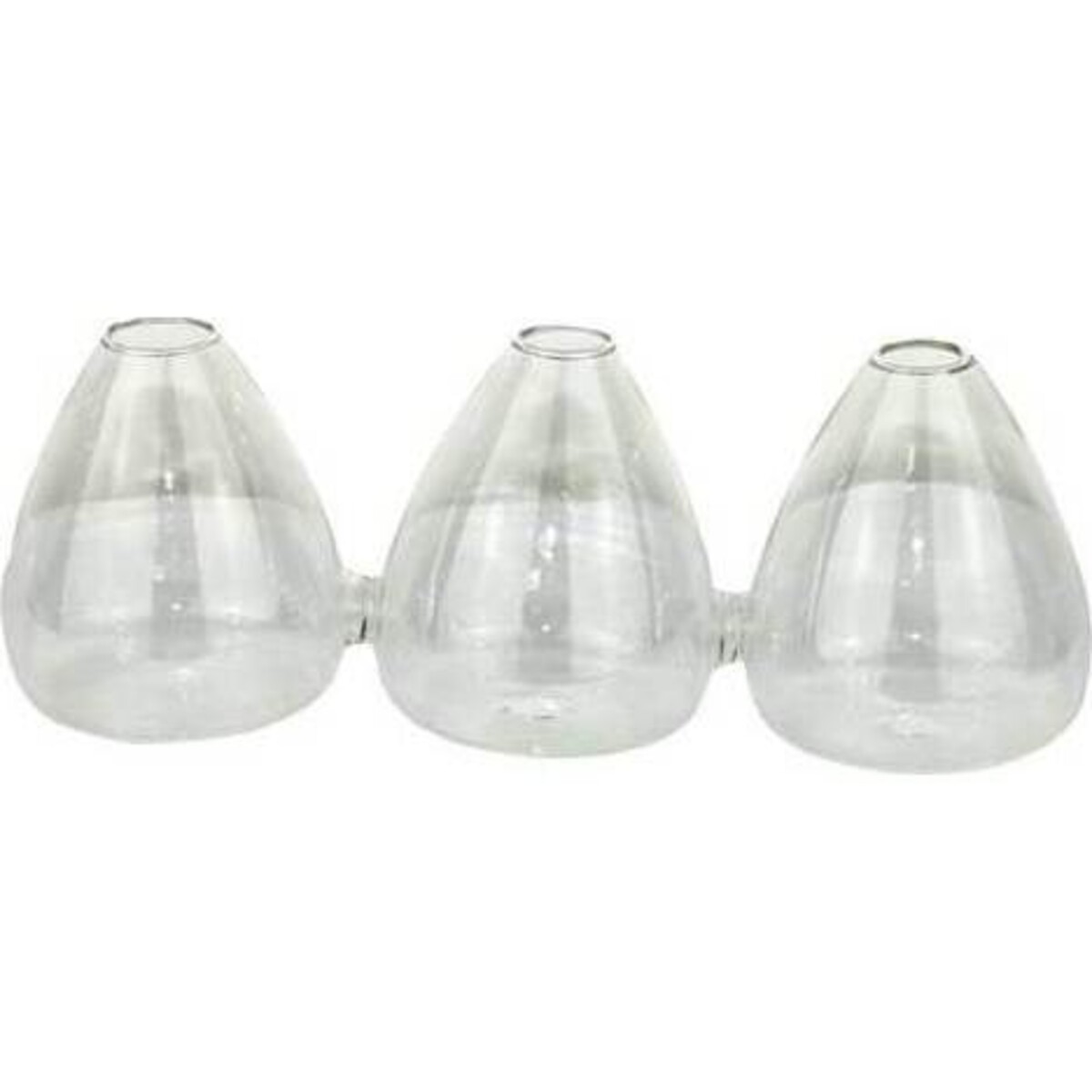 Conjoined triplets-three vases joined together creating the most unique of looks-to help you create a look so different that one would be com pellet to give it a second look. This set of three vases made of glass look very simple but once filled with blooms or foliage will make quite a splash of style and colour.