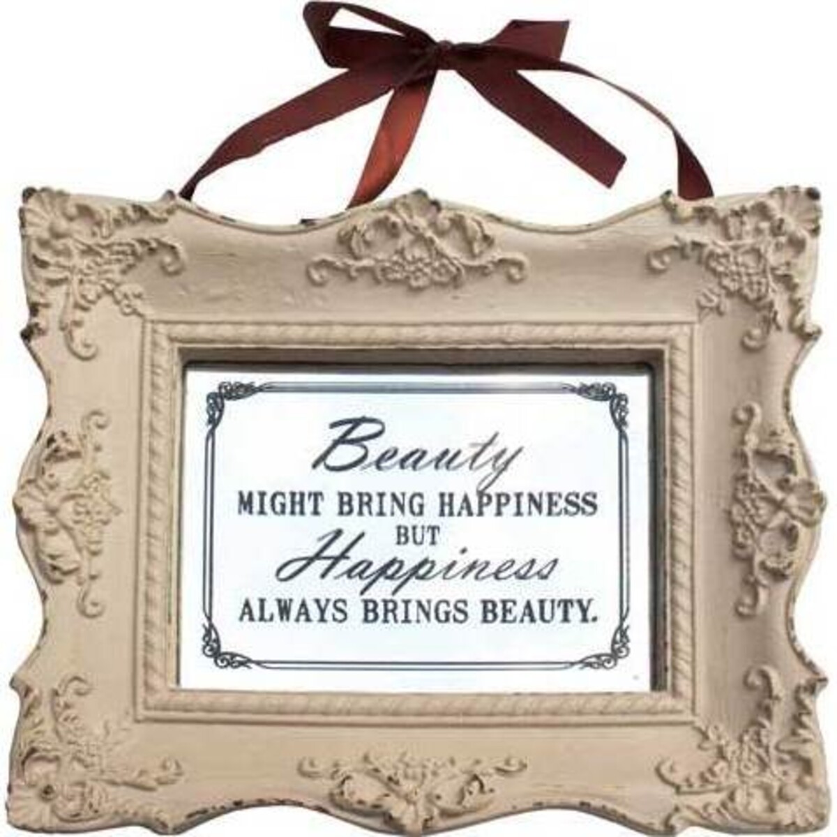 These beautiful decorative accents feature a cream - coloured border with an ornate design etched into the edges and around the centre area. On a white background in the middle are the words, "Beauty might bring happiness but happiness always brings beauty," in black lettering. For a final touch, a dark ribbon is attached in a bow at the top to allow for easy hanging. They're the perfect signs from which to draw inspiration, which means you should put them anywhere around your home where you can see them on a daily basis. They'll also make wonderful gifts for any occasion ranging from a birthday to a wedding.