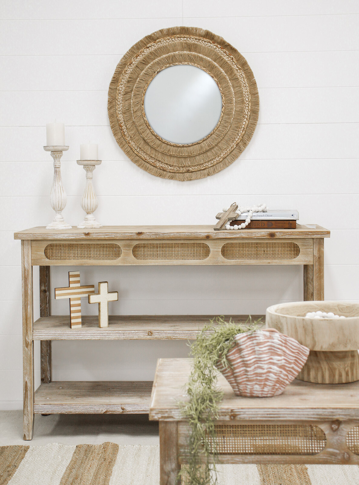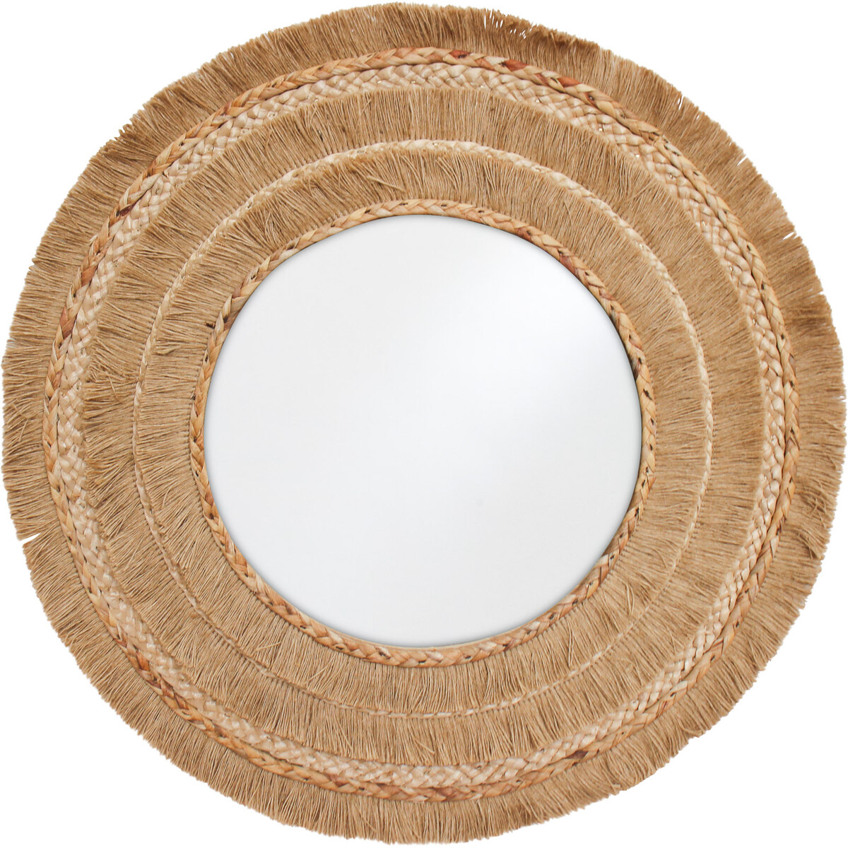 The Mirror Boho Layers has a versatile appeal due to the thoughtful choice of motif and design. Intricately handcrafted in a rustic themed design, this mirror had to incorporate as many as four high quality material components before it could achieve this uniquely appealing aesthetic outlook. It is made in a design such that the highly reflective spherical shaped mirror is placed at the centre, while surrounding it in woven layers are various materials of linen, organic straw and medium density fibreboard materials.