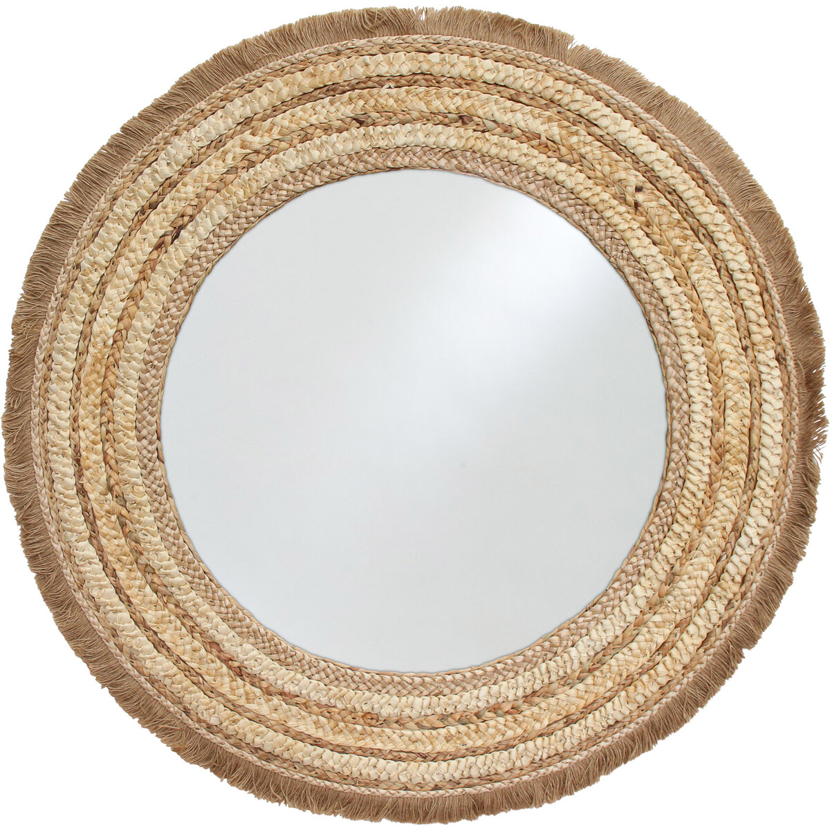 With this Mirror Boho Plait made in a spherical shaped dimension which is fairly large, it has a dimension which measures 98 centimetres in length, 3.5 centimetres in thickness and an equal 98 centimetres in height. It is crafted through the use of as many as material components. The first of these materials is linen which can be seen serving as the decorative fringes to the mirror. The second is highly reflective glass which is located at the centre of this product. The third material component is organic, all-natural straw while the fourth material is medium density fibreboard.