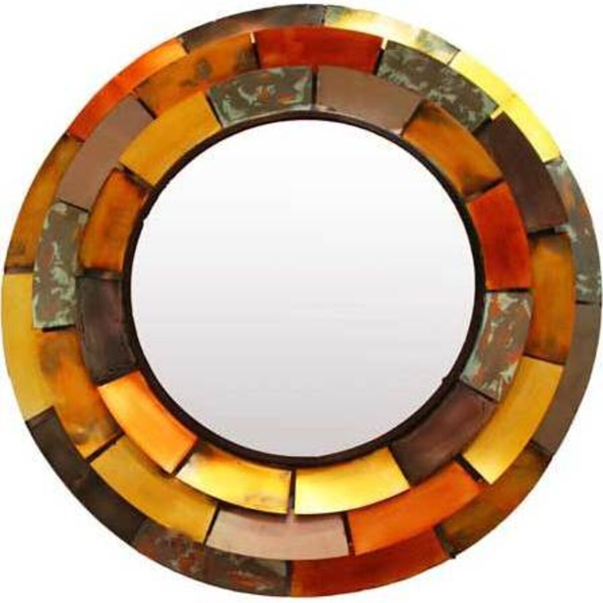 This round mirror features a border comprised of small rectangle brick-style pieces in a variety of autumn hues ranging from orange to brown, all which come together in three tiers with a round mirror at the center. Place this mirror in any room where you need a bright burst of colour ranging from in your bathroom to above the dresser in your bedroom. Wherever you place them, they're going to be lovely additions to your home.