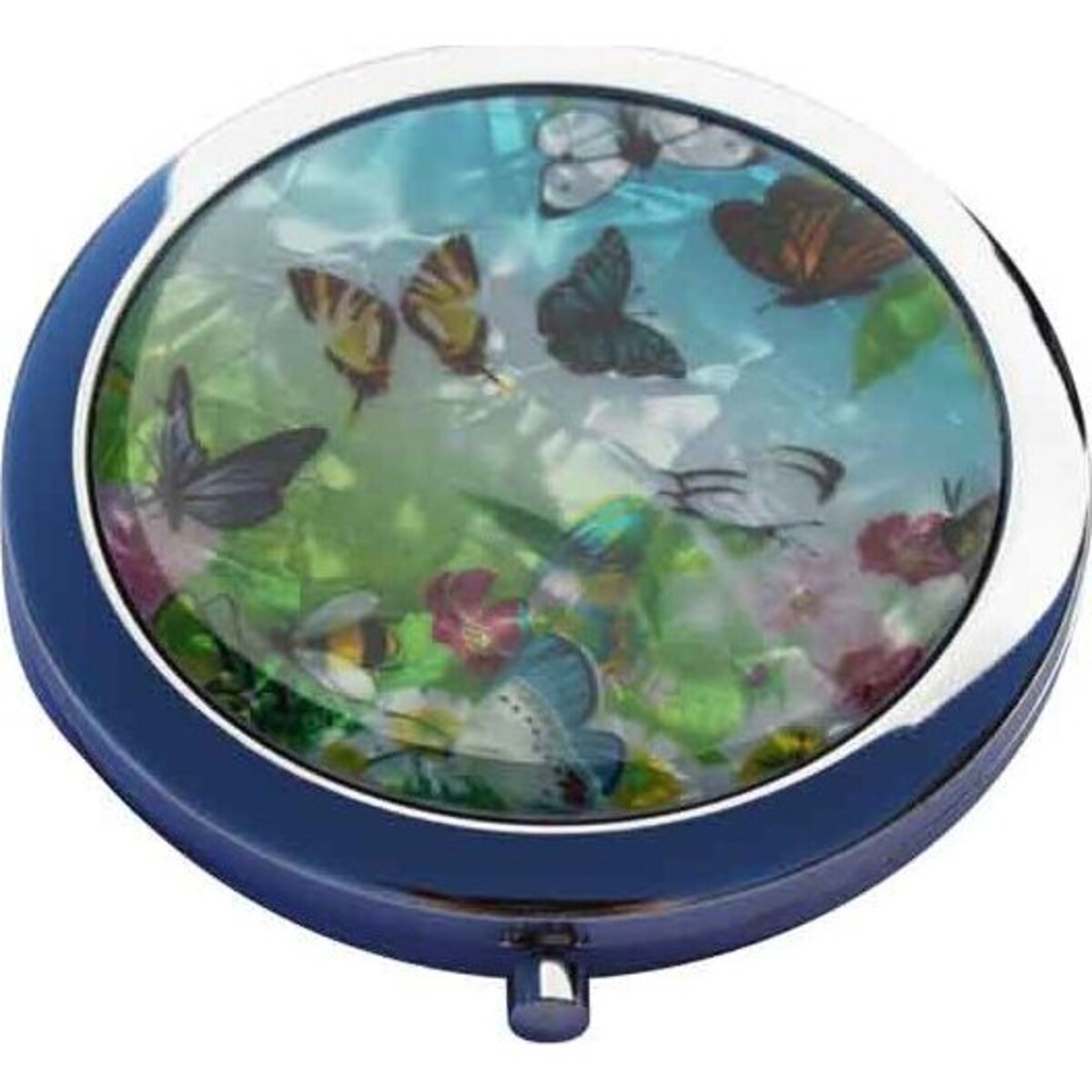 The colourfully painted center cameo of this compact mirror is the highlight of the accessory. Diverse colours burst in a peaceful and nature inspired central picture. Along with the lovely winged creatures are white blossoms in light green field and blue skies for the background. Stylish and chic pearly textured base for the picture completes this exquisite accessory.