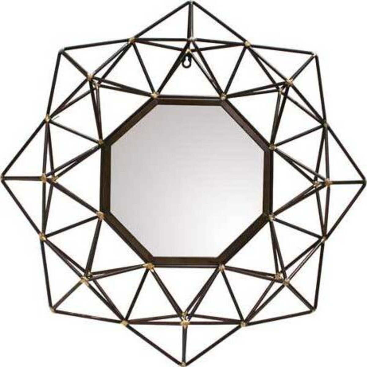The beauty of geometry is employed in the Mirror Constellation from LaVida. An octagonal - shaped mirror is surrounded by a three - dimensional metal cage of triangular shapes for a study in form and function. The bare metal features a natural dark finish with tiny gold accents where the triangles intersect. This simplicity of this mirror makes it right at home in a variety of decor styles from industrial to modern and as far as rustic farmhouse. This large mirror is 62 centimetres across and 10 centimetres deep. A self hanger is included on the back of the mirror.