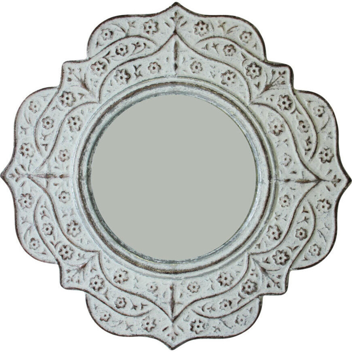 Mirrors are a great means to add a touch of spaciousness in overly small spaces-they in fact help reflect back light and thus open the space out considerably. In small spaces adding a mirror such as this will instantly add depth and dimensionality. This charmer will of course bring in an old-world look owing to its very vintage appeal. The off-white distressed metal look and the clarity of glass combines wonderfully. The wonderfully intricate pattern on the frame lends it an artisanal kind f beauty most impressive. The piece will be suitable for all wall spaces right above the side board or above the console table where you could place lamps or candle stand that could get reflected in the evening hours lending more brightness and depth to the piece. Will also look especially beautiful as vanity area mirror. All of 56 cm in height and 55 cm in width, makes it just the right kind of size for all kinds of walls.