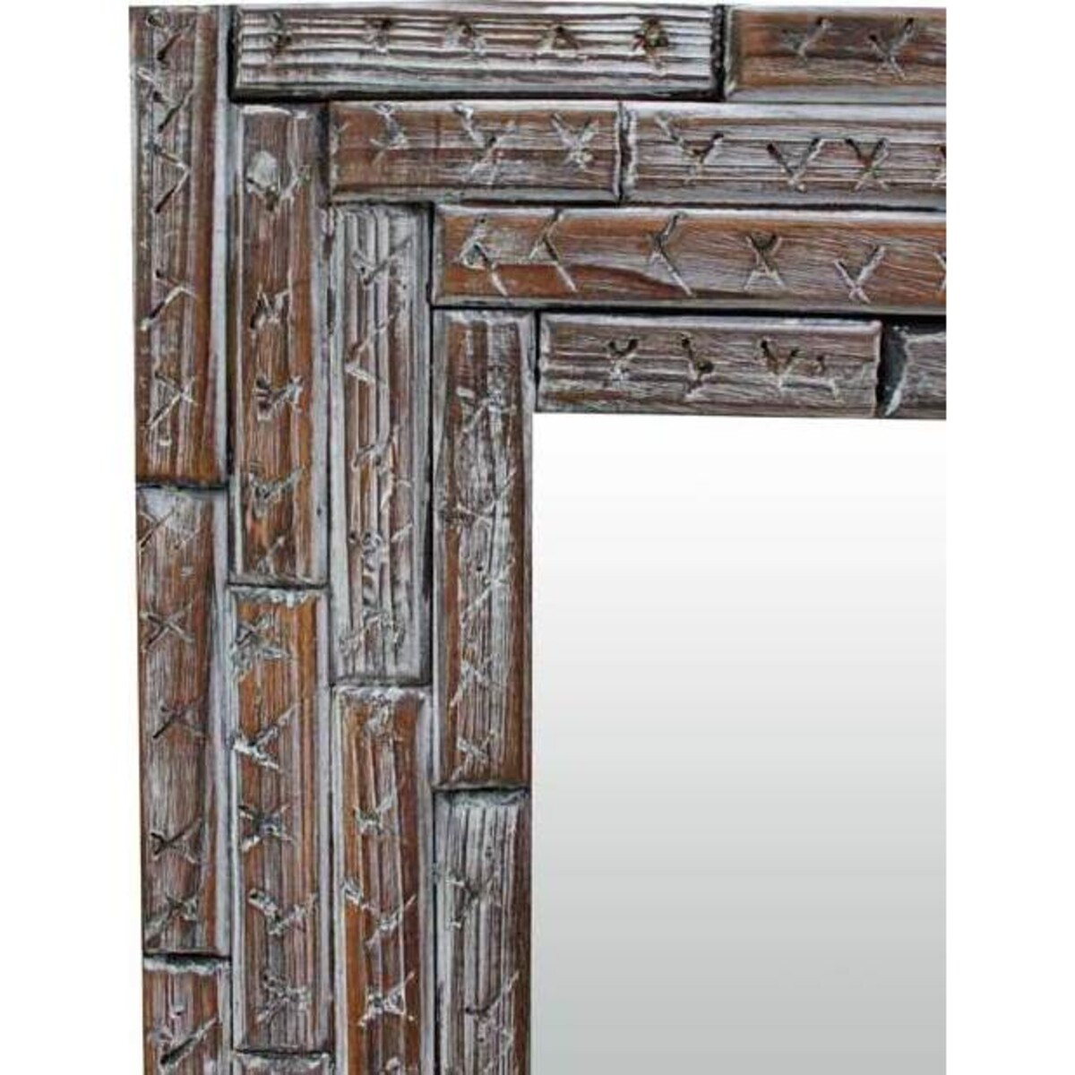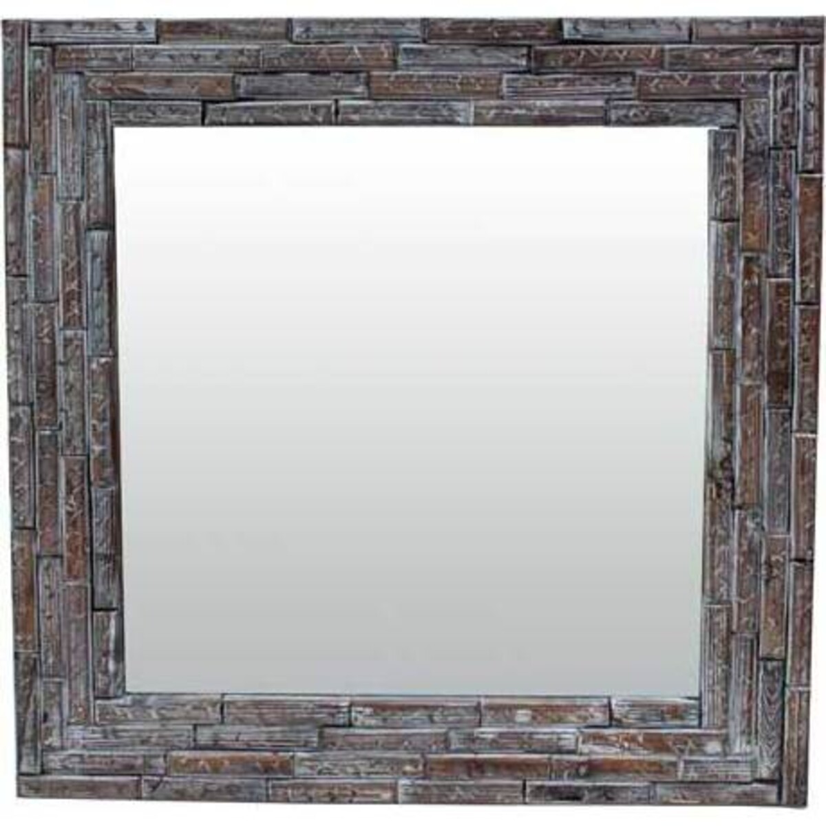 This mirror measures 90 x 90 x 5 cm and has an earthy and rustic look to it. It is very close to nature since the border is made of carved wooden vertical and horizontal plates.