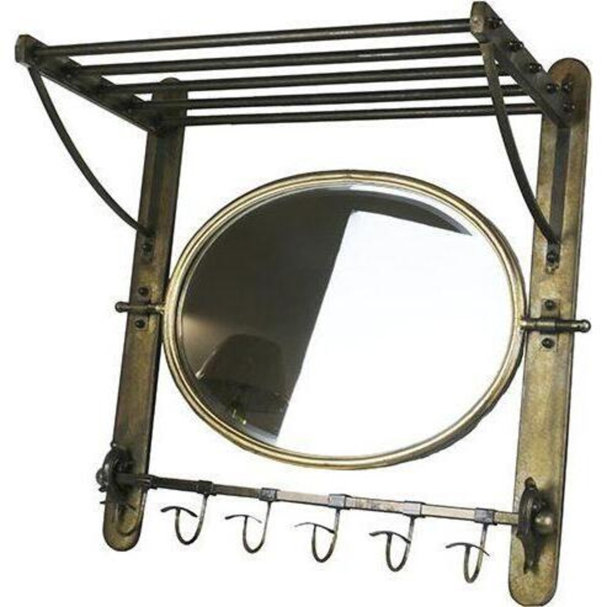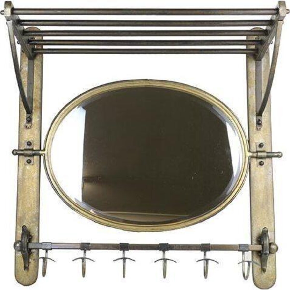 Solid styling in metal with a rack on top that has bars running horizontally, below which is the oval mirror and right at the bottom of the bracket come the set of hooks. In all tis is one composite organizer that allows maximum usage of space in the best possible way. The rack on top is wide enough for placing a number of things while the hook set with its multiple prongs having t shaped ends will create just the right space for you to lace al your hang able stuff like hats, windbreakers, umbrellas and al. The length of the rack is all of 57 cm while the height of the entire rack is 65 cm. The burnished gold coloured metal used in the entire structure lends it a lovely antique look that should fit in well with most kinds of décor. Place it the children's room , or the entrance of your home ?or simply make it part of your kitchen where you could place several pots and pans, your towels up on the rack and some fresh herbs in pots. The mirror brightens up the space and allows you a quick look at yourself in the middle of some hectic cooking.
