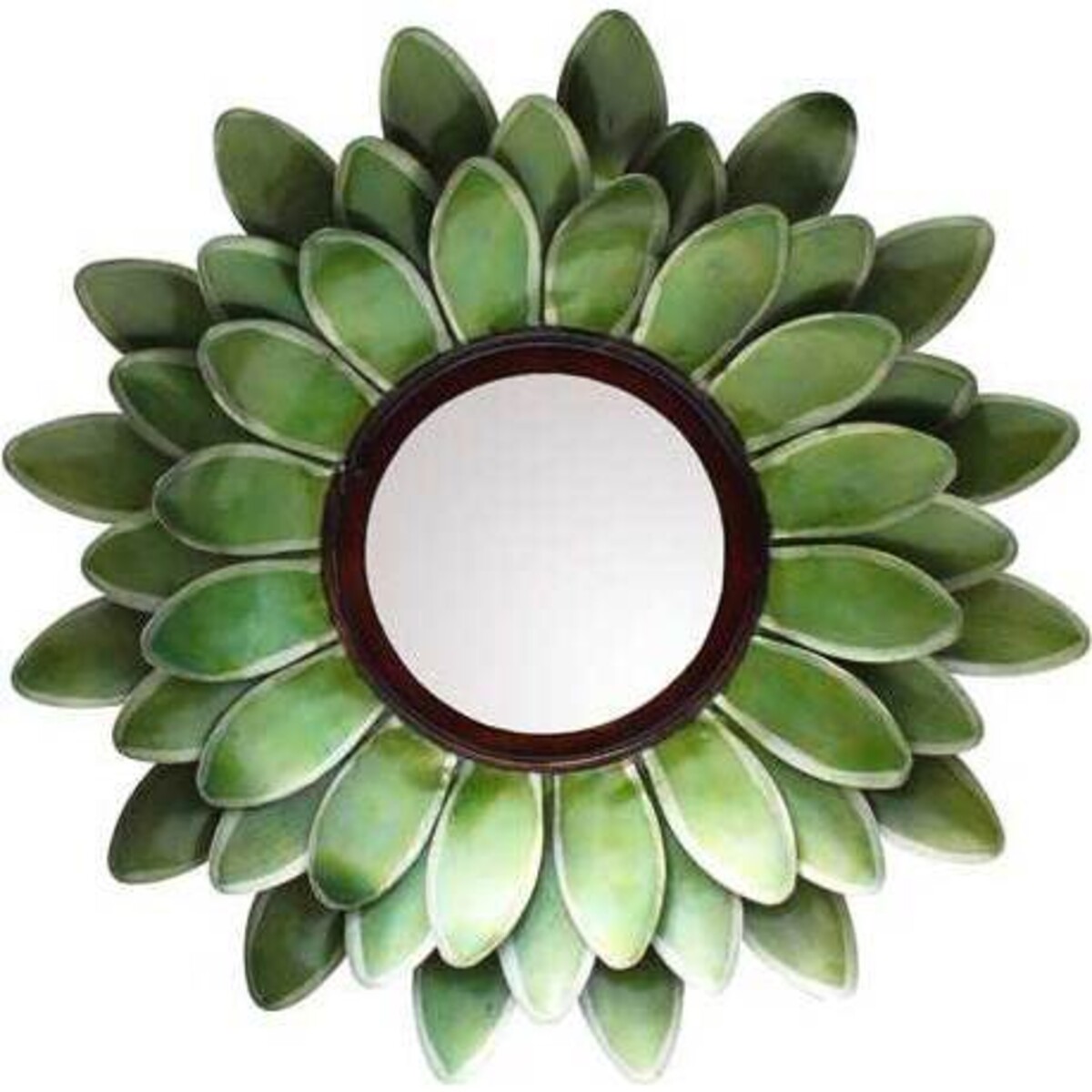 Three layers of curved, teal green petals add dimension and depth to the Mirror Teal Flower from LaVida. Layers of metal leaves, finished in variegated tones of teal and green create a lush, tropical feel to this wall mirror. The round mirror itself is encased in a ring of complementary rich bronze metal. Perfect for an entryway or small bath, this small - scale mirror makes a pop of colour on the wall alone or can be used in groupings to create a larger style impact. This mirror measures 35 centimetres in diameter and is 5 centimetres deep.