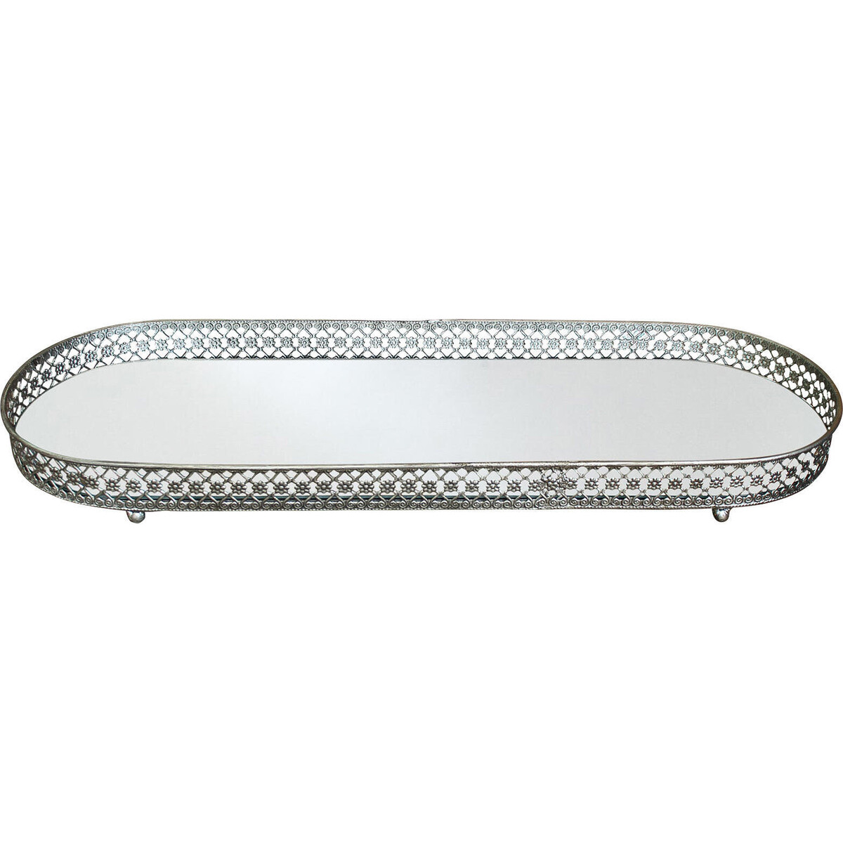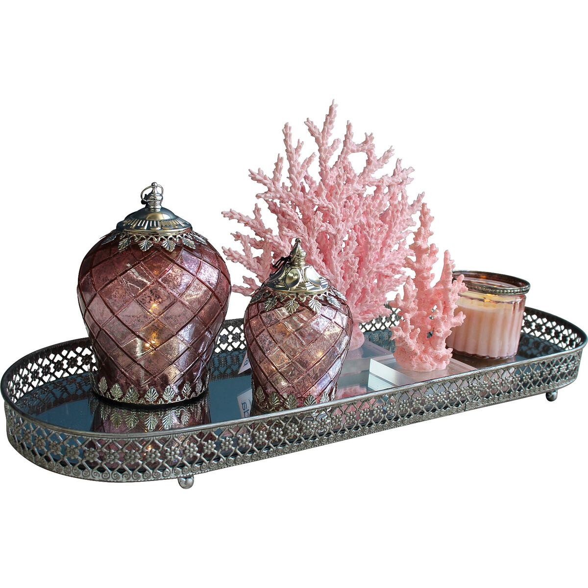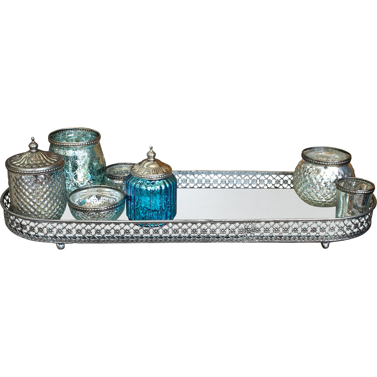 Add the touch of vintage glamour by adding a display tray that helps liven up your displays in the most efficient of ways, after all with a winning combination of sleek good los that mirror and metal bring to you-can you go wrong. Here is a long tray with a length of 60 cm, and width of 20 with a curved body and a raised rim. The delicate filigree edging it has helps build in the touch of antiquity and class. You could place votives, other displays, potted plants in small sizes and any such article that you wish to club along with candles. Once lit the candle placed on this tray will bestow a bright glow owing to the effect of the mirror top of the tray. Add this splendidly crafted piece to your décor and make other décor highlights possible in an easy way.