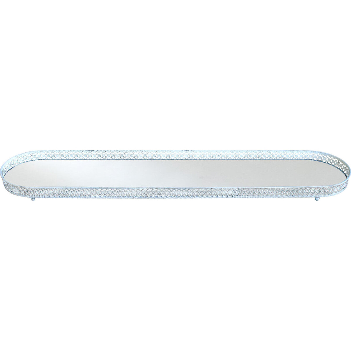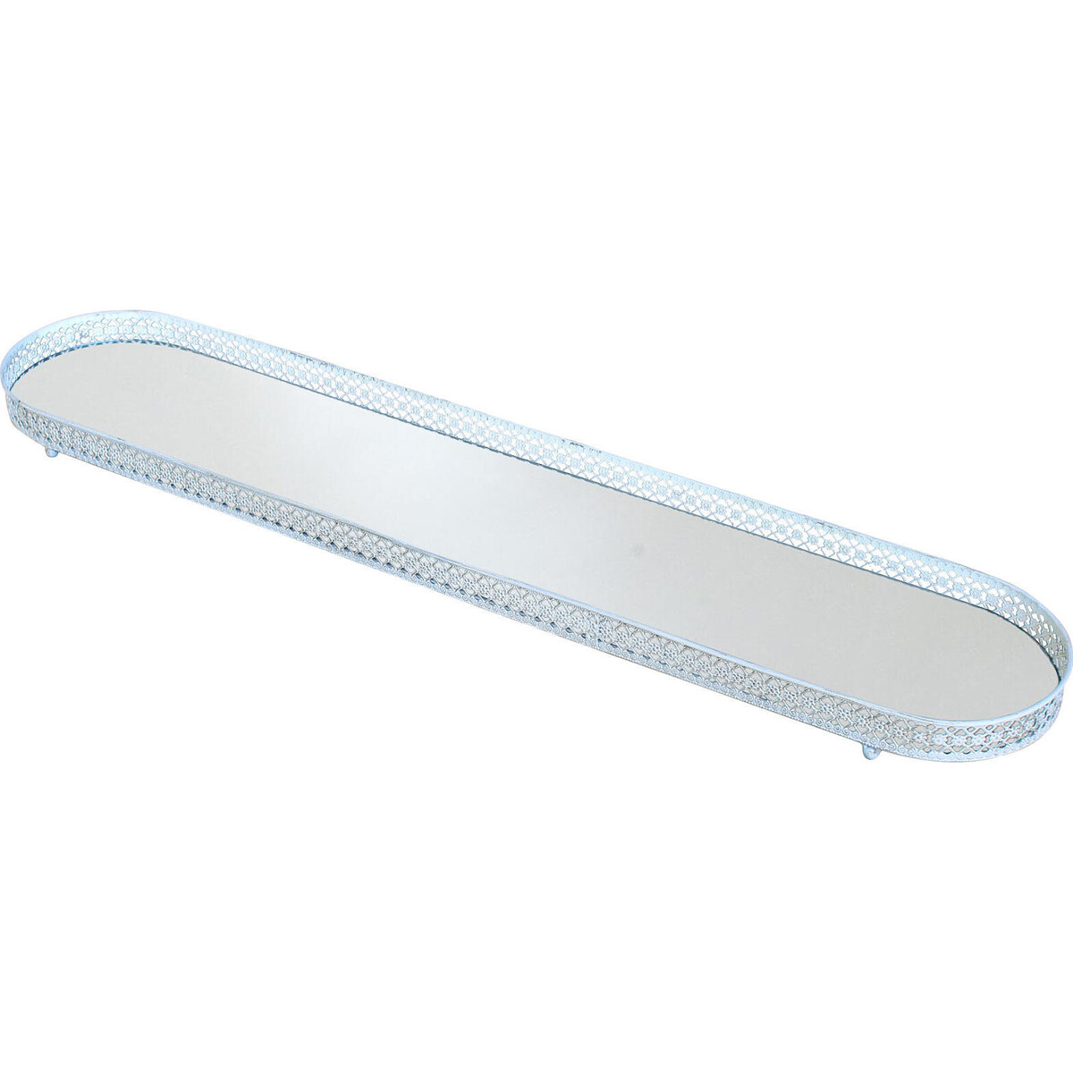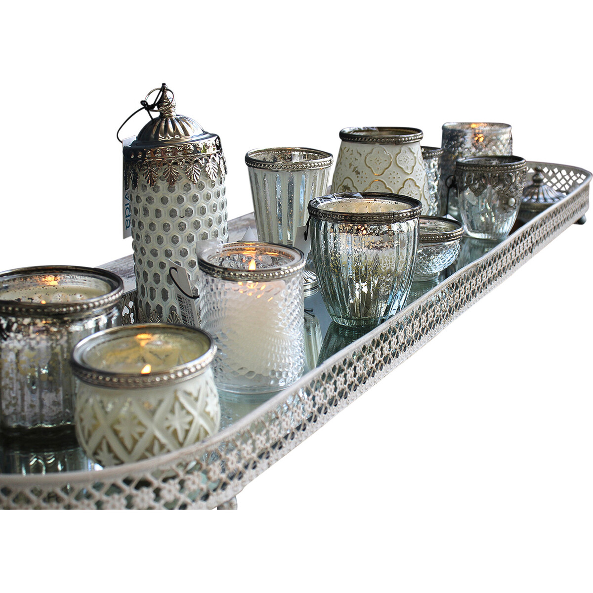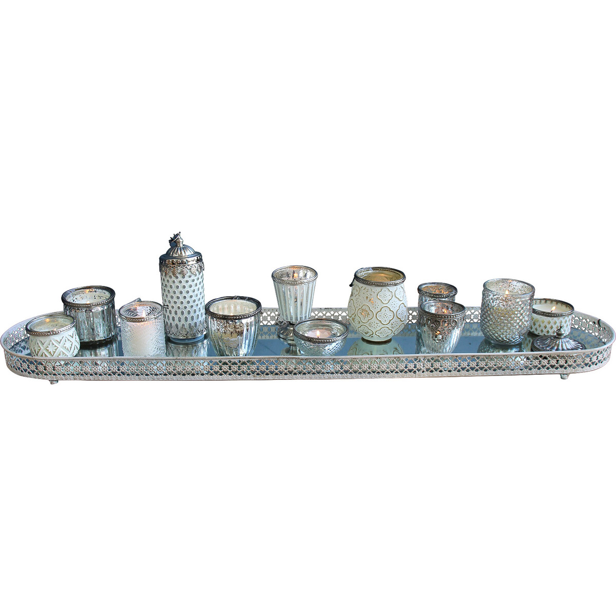 Bring together the charm of your candle displays and votives t a high point with this tray that helps assemble them on one platform for a better impact about 100 cm long, its width too is enough tp give adequate space for all your candles urns. Tiny potted plants and the likes. This beautiful low tray ahs four tiny legs made of metal that hold on fin giving enough stability to the tray the mirrored top is effective as reflective surface especially when you place lit up candles atop the tray. Will look especially appealing of you wish to create a display with your illumination accents for a centre piece or along the hallway table. Will also help you cluster your potted greens that are in small little planters. You could place this tray with your glorious greens and help create a beautiful indoor display with them. The antique look tray is created in such a way that it will look as grand when used as a platter for serving tiny bowls that could be loaded with nuts and cheese and the likes or simply sue it in your décor as suggested.