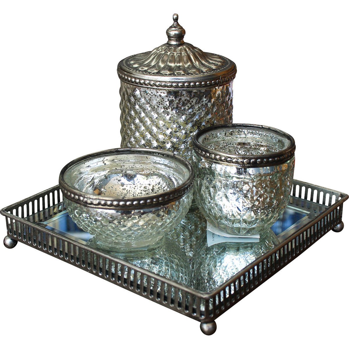 Add the look of class and sophistication in a simple stroke of genius. Here is a square tray fabricated from mirror and metal that will help highlight the beauty of your vintage setting could be a s resplendent topped with candles or votives as it would be with flowers or even the food you wish to serve in bowls. Placed atop this beauty, things begin to attain a different kind of magic.