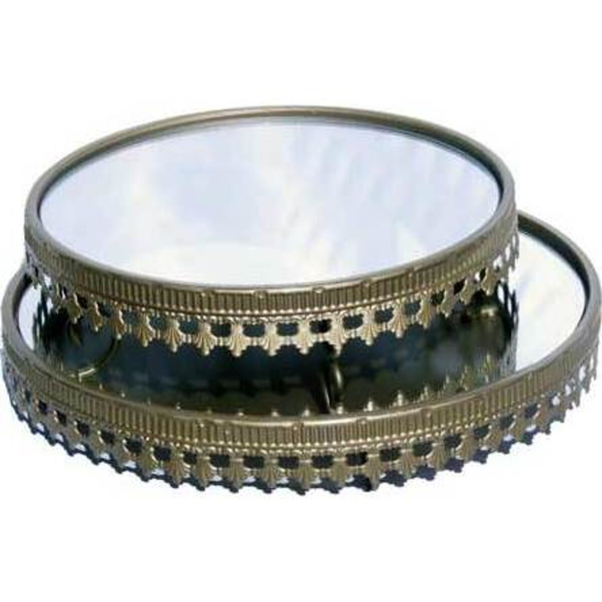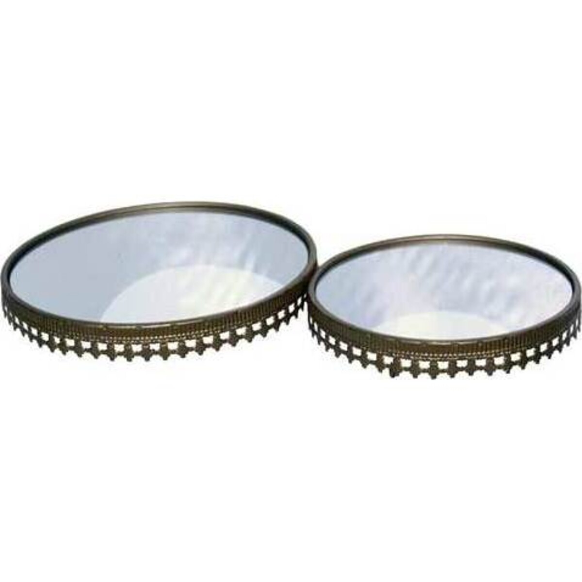 A unique combination of metal and mirror makes this piece one of those pieces of utility that makes all the difference with its beautiful good looks and its ability to perform its function. Trays usually do not garner that much in terms of attention but this set was created for receiving compliments. The mirror will catch the light and reflect off the things carried or placed on it while the rim will allow a good grip. One would also use the two trays to place eatables on and keep it at vantage point for guests to help themselves with. A pretty metal trim and the chrome coloured finish gives the set a unique beauty. The two trays vary in size and thus can be used for different needs. A little more than a foot across at 33 cm diameter and the other at 28 cm, it would be easy to handle and move around with. Merely placing things on it and leaving them at a larger table would also serve the purpose. Cleaning can be done with ample ease and the mirror surface can take liquid spills and will simply clean off with a swipe of cloth, while the metal has been given an antique finish which does not get tarnished. A great buy for those who like to serve in style. Its usage as a centrepiece for the dining table also makes it uniquely decorative.