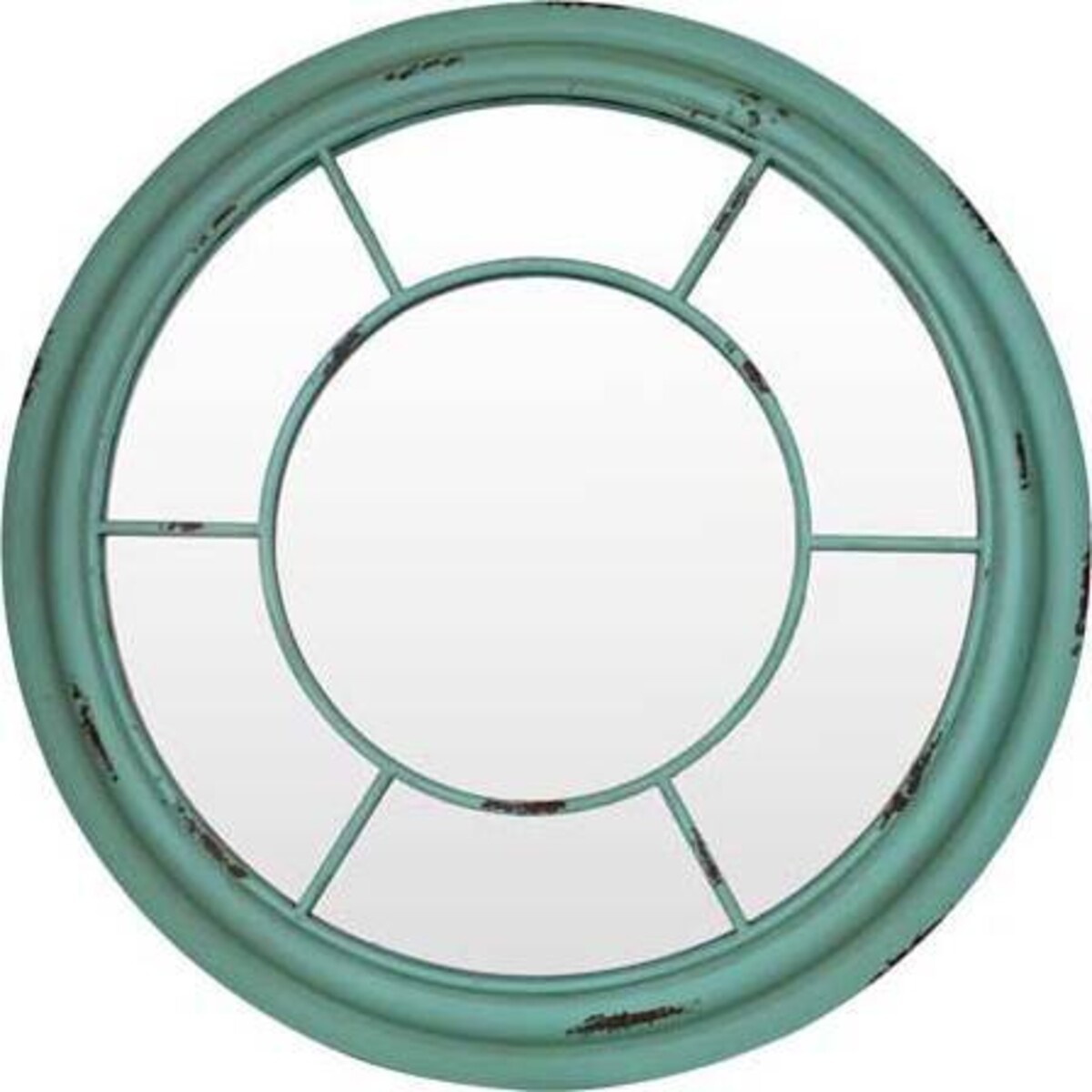 Mirrors are an essential element in all kinds of interiors be it home, office or commercial set ups and when the decor permits one to experiment it could also be a great way of adding style hints in a subtle manner. This round teal coloured mirror is simple in its design - in fact quite rustic with its distressed paint effect and will add that period look drama to all kinds of spaces. About 2 feet in diameter this is one mirror which with its rustic presence and its colour pop will surely garner a great deal of attention not simply for the image it will reflect but also for its uniquely simple sturdy and prominent design. Almost like an ancient window design one could see in the attic –the frame work is reminiscent of the times of the old cottages in the country that seldom saw a fresh coat of paint. The quality of mirror used is of a superior kind. The piece can look as wonderful in the entrance of the hallway as in the children's or master bedroom as well.