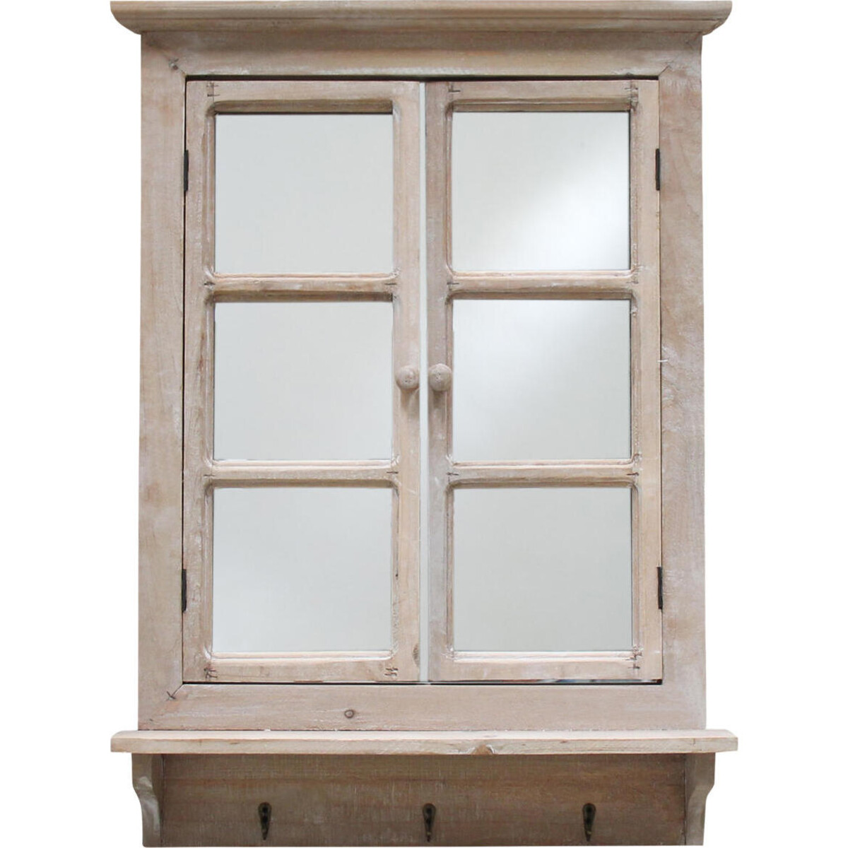 Adding accent mirrors on the wall touches it with a quiet kind of simplicity and yet develops the look of sophistication as well. This shabby chic style mirror is truly a whimsical feel mirror encased inside a typical framed window with four pane- like opening. The glass shows through this in a way that you are tempted to check your image. The shelf adds a touch of detail and will help you display plants or accents to make the look of the mirror all the more attractive. What adds to its charm of course is the choice of wood and the kind of finish it has been given and the lovely tiny knob handles with which you could open the window to take a better peek at yourself. This would make a splendid mirror for a wall that could help define the space. As it is large enough at 75 cm in height and 53 cm win width-in fact with the additional hooks at the base it would make the perfect entryway accent that you could count on for defining your home?s welcoming look.