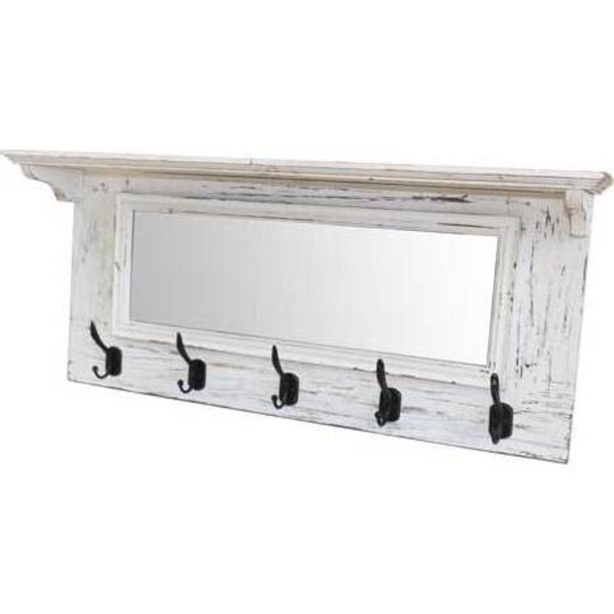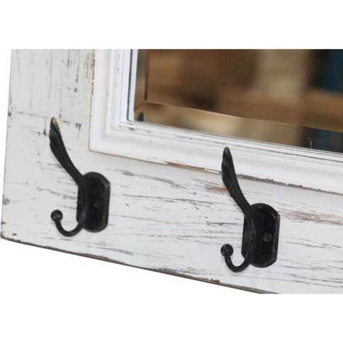 Created with care - this shelf fitted with a mirror has a shelf on the top and comes with a set of six hooks that look well defined contrasting as they do with the distressed paint finish given to the bracketed mirror. The shelf on top is an added bonus as this could also be used to keep books or curios or all those memorabilia like old pictures, little trophies or collectibles that you would want to display safely. The hooks of course come into play for their usage as a place to hang umbrellas, bags and coats and jackets. There are so many places where this décor piece can fit in with ease. The mirror will make the room more spacious while picking up one's satchel or nook, one could also check one's refection in the mirror while leaving home. It could be placed in any room that needs to keep itself more organized. It would be especially suitable for kitchens or the children's room or even the entrance of the home where a set of hooks can be quite helpful.