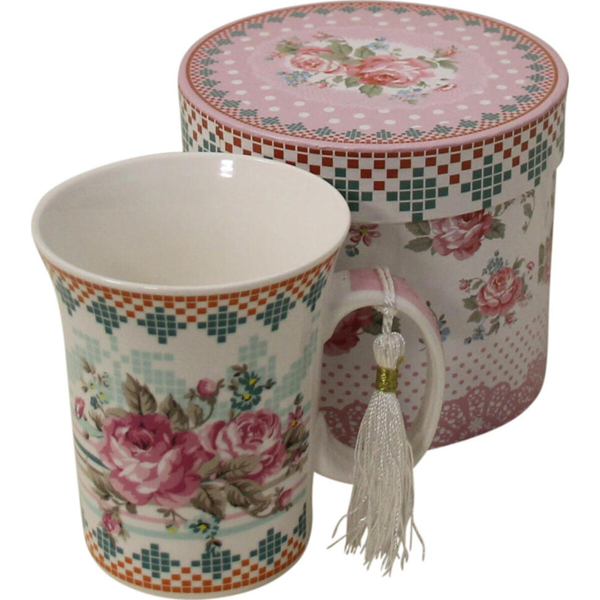 It comes wonderfully packaged - the cardboard box, round and delicate printed much like the exact print on the mug itself. As you lift the lid, you can see the white mug adorned with a fine rose print. The lovely floral print and the fine texture and quality of the lightweight ceramic adding to its great value. Would be a great addition for your home as much a s wonderful gift for any tea or coffee enthusiast. The tassel that hangs from its handle lends it that touch of something special. The cup feels easy and light to hold, retains the heat of the beverage in it and looks vintage chic in its look when sitting atop your coffee table. Adding that fine spot of class and appeal to your coffee drinking time.