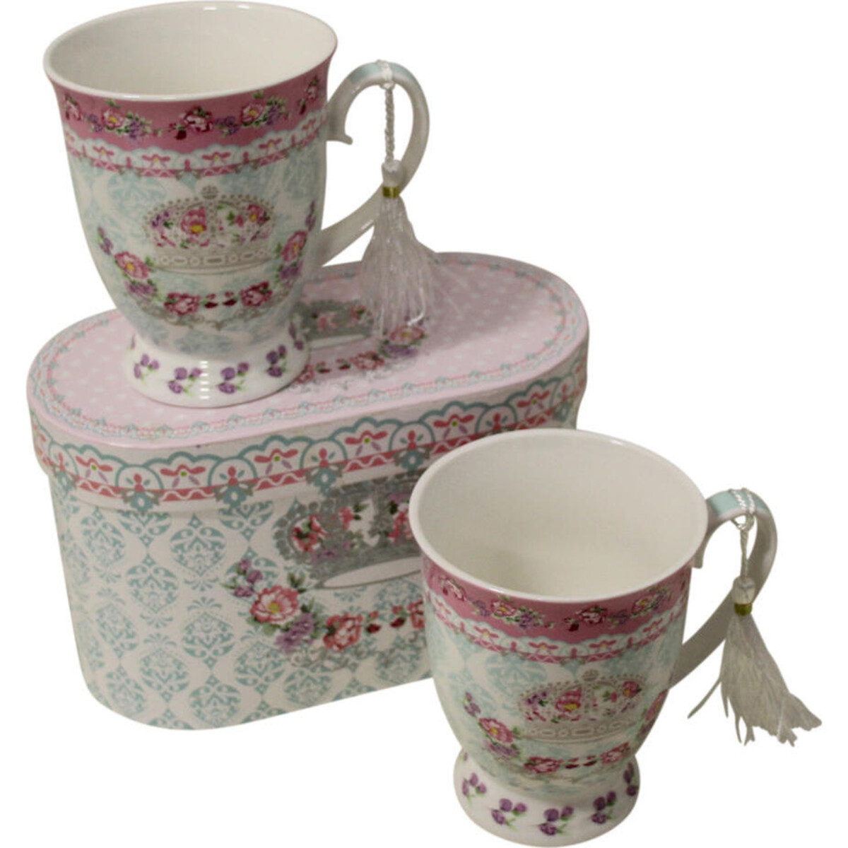 Make a delightful impression at your coffee table or give way a set of mugs the receiver is simply going to get floored with - regal, sophisticated and undoubtedly vintage in its inheritance of looks. This is certainly not the kind of set that anyone can pass by without being impacted by its sheer look. Delicate floral print goes fabulously with the pale colours chosen for the look. The tiny tassel on the handle lends that little detailing to add more class and regal. The mug sits graciously o its small little round base rising even more elegantly to a curved tall shape. The height of the mug is all of 11 cm. The two - cup set comes packaged in the most fascinating of packs that wear the same look of beauty and grace. The touch of pink in places and the print of a crown adds to its almost regal and aristocratic looks. A fine collector's piece that will sit with pride amidst all of your bone china with the same confidence.