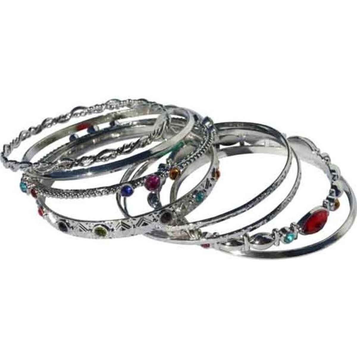 The Multi Bangle - Muti Diamonte - Set 8 looks stunning with its eight individual pieces. When worn together, this eight-piece bracelet is sure to turn heads and steal glances. But unlike most multi bangle bracelets, this one does not look flirtatious at all. Instead, it features an unmistakable elegance and luxurious look. The artist also made use of different style and design patterns in crafting each of the bangles. Some are thicker while some are slimmer and some have stones engraved on them and some have none. Another interesting feature is the use of differently coloured stones. There are small round cut stones and there are also large marquise-cut stones. The multi-coloured stones really create a beautiful contrast with the silver polished bangles.