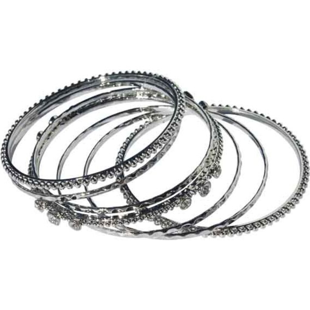 The Multi Bangle - Triple Diamonte - set 7 is a very fashionable bracelet that consists of seven separate bangles. Together, the seven pieces make one stylish bracelet that is brimming with details and shine. This is definitely one jewelry set that makes a strong statement with its many pieces. Looking at the design, the bangles are sculpted to have different looks. Among the seven individual bangles, there are four of a kind, a two of a kind, and one unique bangle. The four of a kind bangle are simple and only feature a faceted surface. The two of a kind bangle feature a more intricate design with its metal beads. But the main piece is the middle bangle which is unique in design. It features a set of embedded faux diamond pieces that shine like real ones.