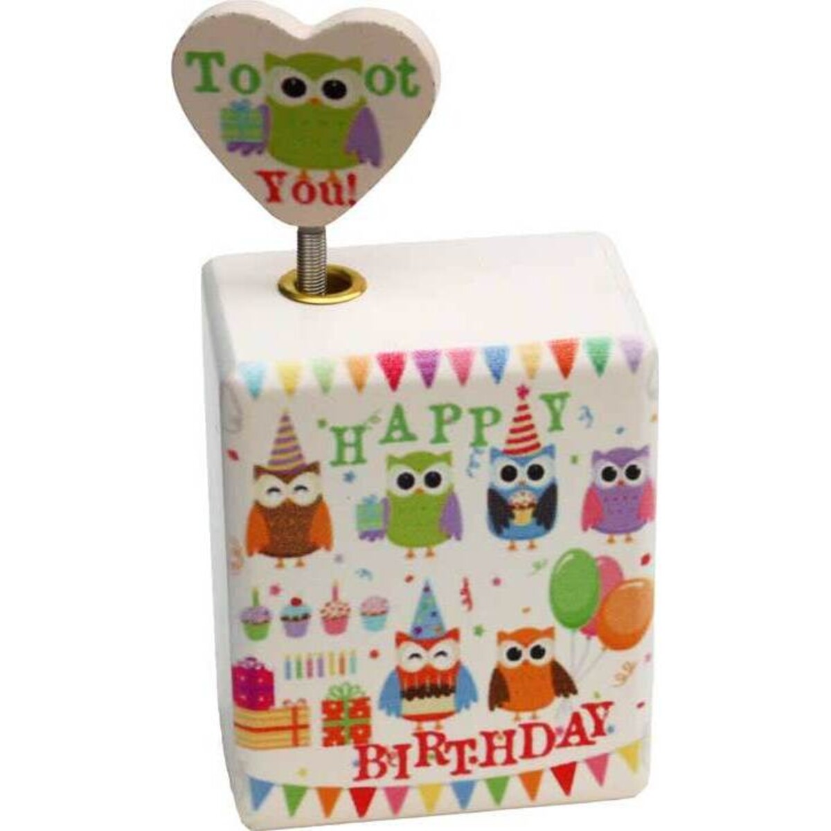 A toy, a message and a good luck charm that will keep the feeling of birthday last longer A perfect gift for those children who are discovering the joy of auditory stimulus. The smooth edged box is ergonomically designed so as to allow the child easy handling and the graphic on the music box of a merry band of owls is utterly adorable -a picture any child would love to see again and again. The Music Box has a clear sound and strong enough to withstand the rough handling children give to their toys. Buy it not just for the joy of gifting but for the pleasure of finding something so perfect for a child.