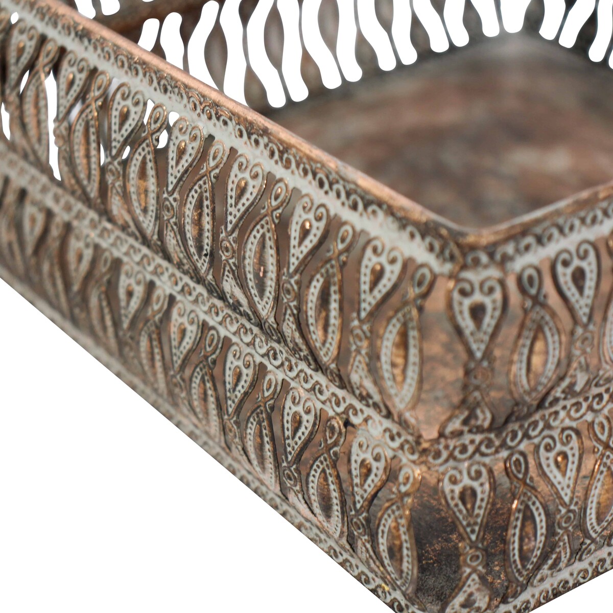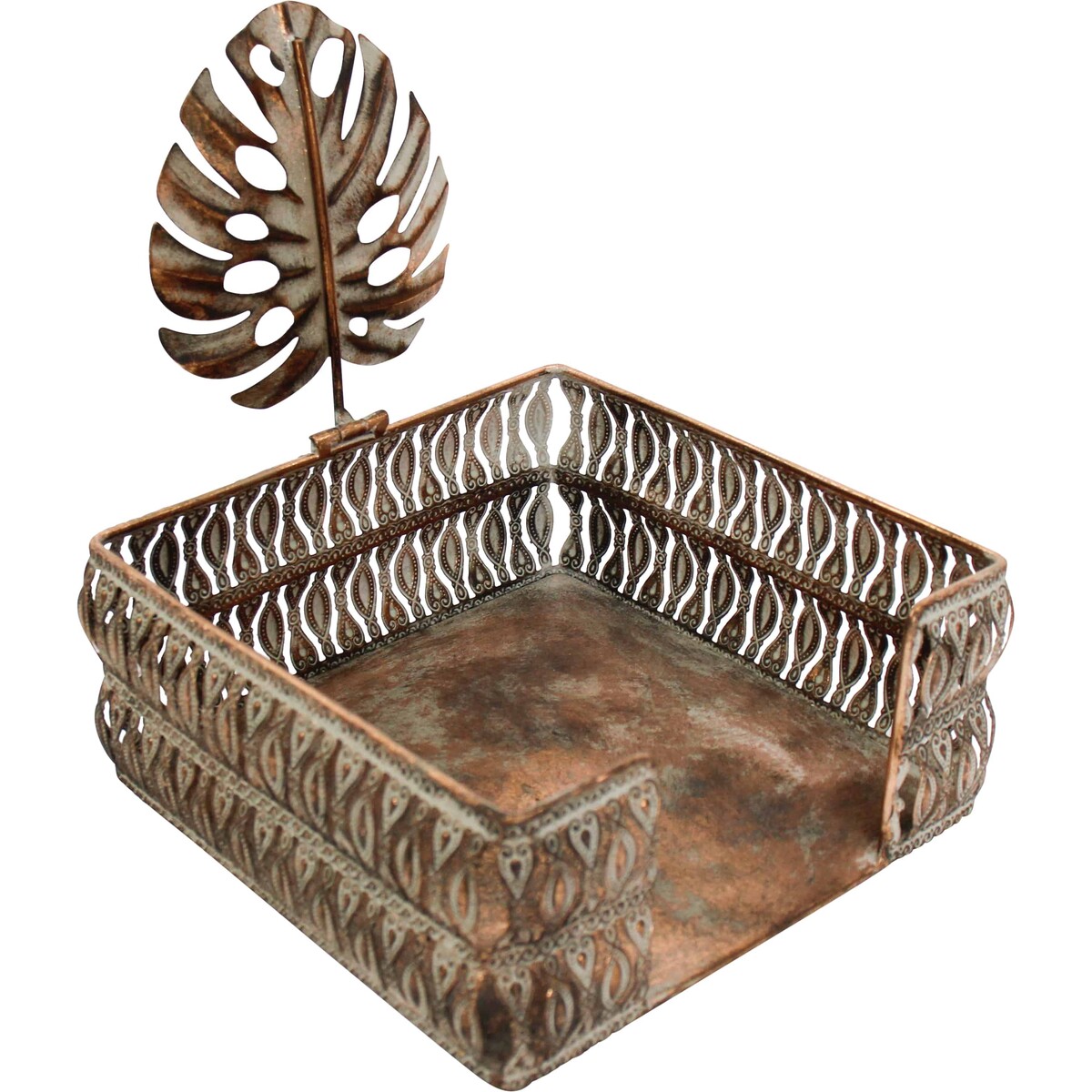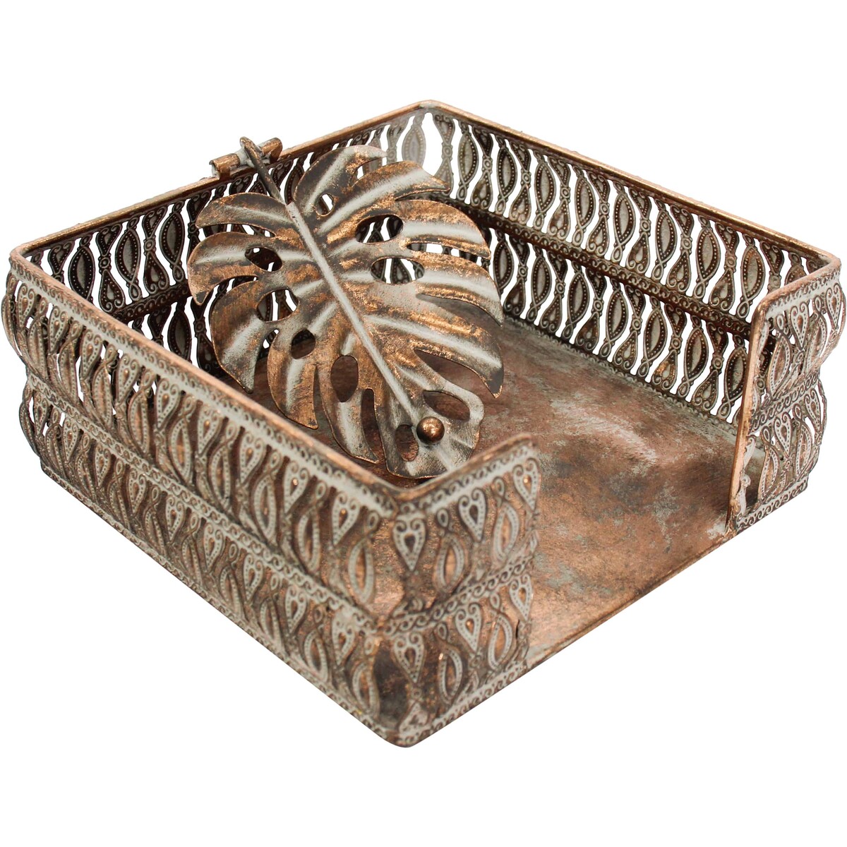 The Napkin Holder Aria is one of our most recent additions to our huge and versatile category of Wholesale Kitchen & Table products. This particular piece has an ancient ornamental appeal and capacity given the choice of metal, the ornate ancient-looking design and the choice of light white washed colour over a general bronze themed background. It is made in portable square shaped design.