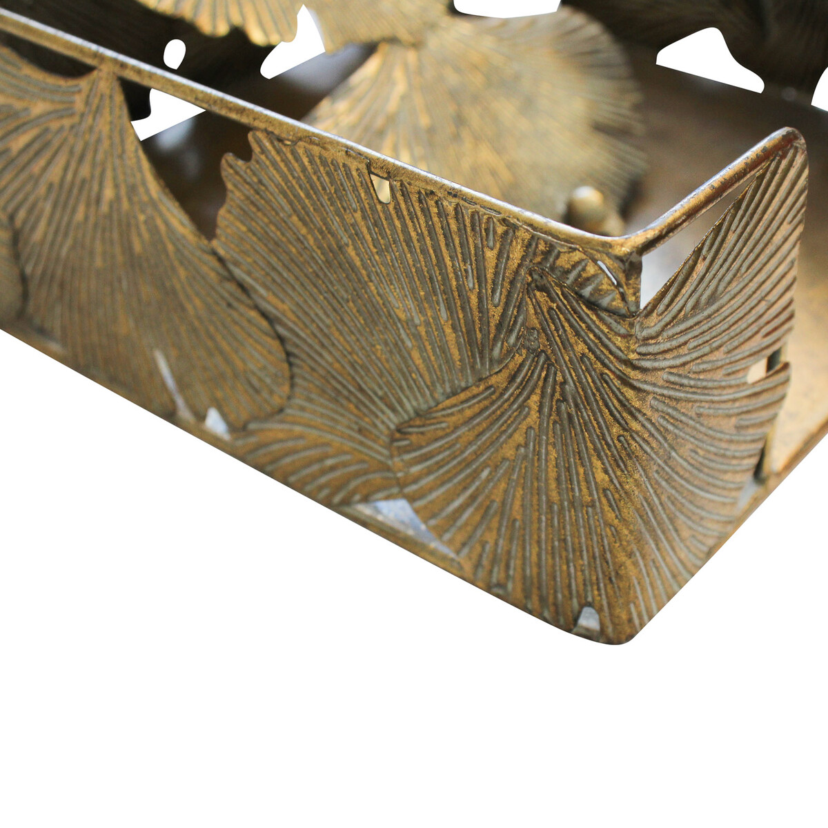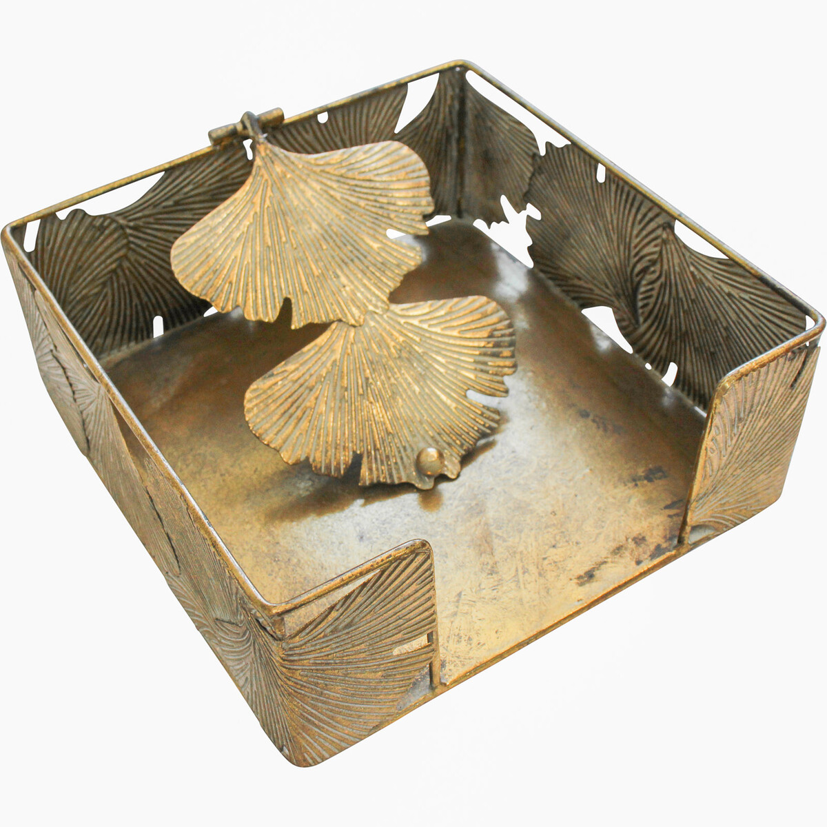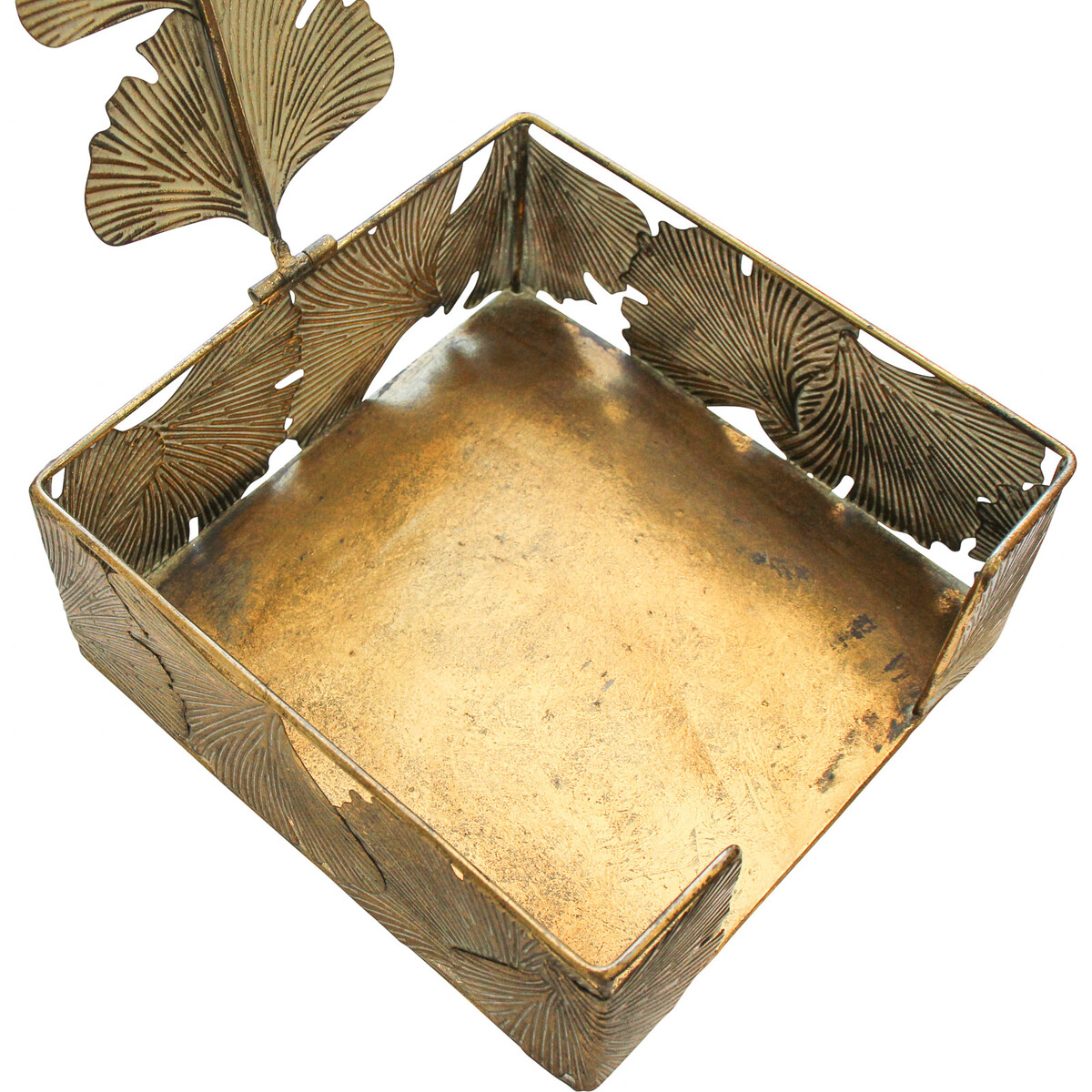 Hand crafted in a square shaped, fairly large sized dimension, it measures 20 centimetres in its overall length, 20 centimetres in width and just 9 centimetres in height. While the whole napkin holder is wrought using premium grade metal, the interior base is composed of a flat metal while the sides are formed through the inter-connectedness of lotus leaf shaped metals with spaces in-between one another. Apart from the lotus leaf ornamentation, it is then luxuriously hued in appealing gold colour.