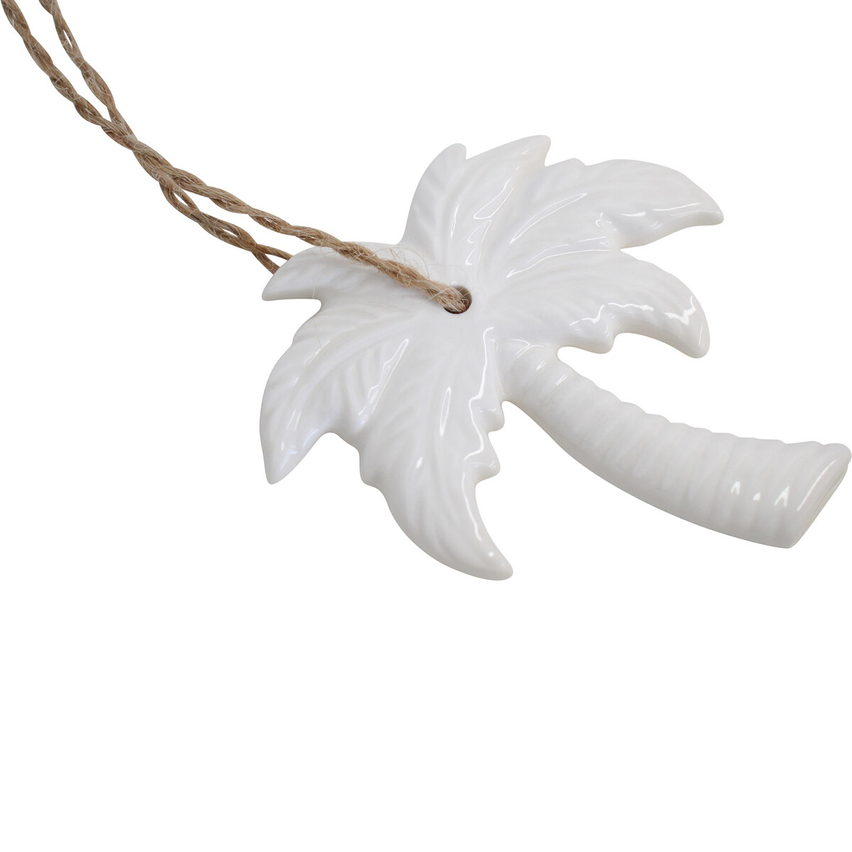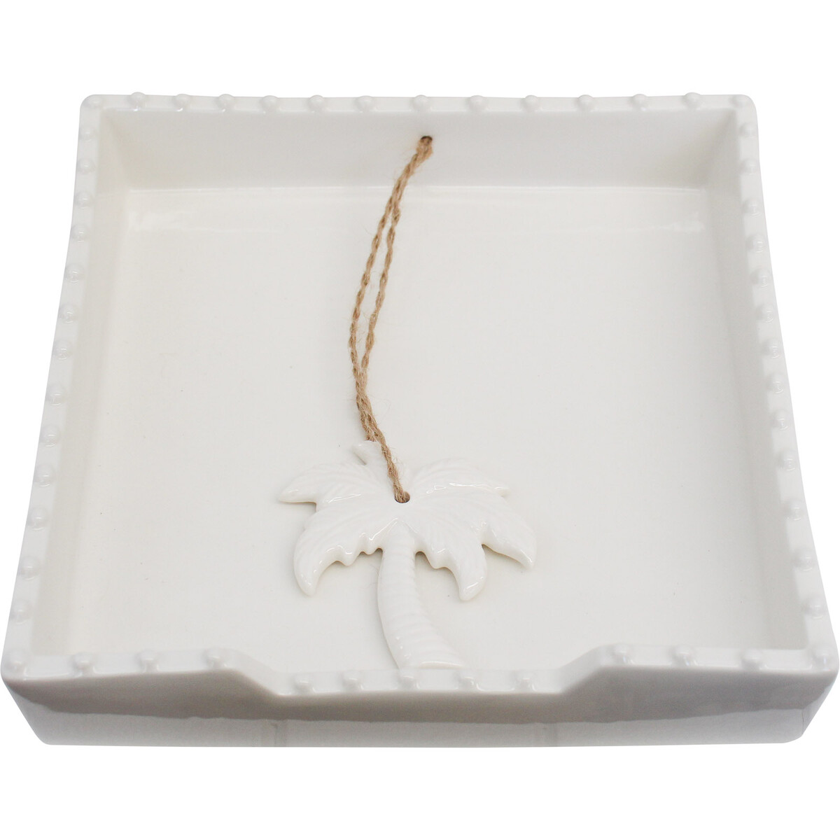 Delightfully simple in its design - the trough of this tray has the kind of depth that will easily hold a large stack of paper napkins which tend to get disarrayed if not pressed down und er some kind of weight. Coordinating with the white ceramic body of the tray is this palm leaf design weight that is tied ever so neatly to the top pf the tray with a hessian twine. Large enough and heavy enough to do its job well. It can simply be placed on top of the pile of napkins. Say goodbye to the usual messiness associated with paper napkins that seem to find the smallest of chances to fly around or look most untidy when placed into any other kind of holder. Here is one whose design details will amaze you with its artistry and effectiveness. The tray is square in shape with 19 cm dimensions and a depth of 4.5 cm.