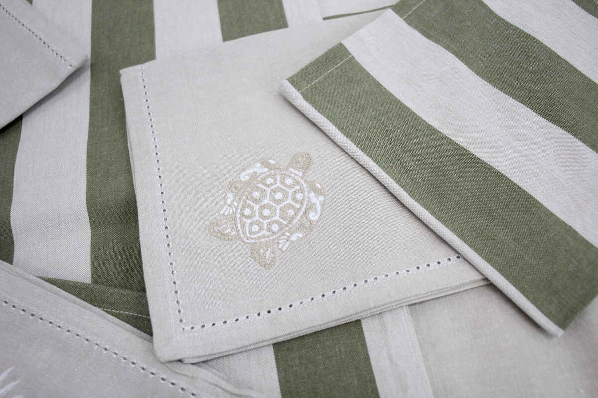 The stonewashed chambray cotton on this Napkin Turtle is a fantastic combination of relaxed and elegant. The hand embroidery makes it a beautiful option for a themed table or a nice way to add some subtle character to a natural palette. And although the design is quite subtle, it can be paired with the matching Turtle Table Runner for something more cohesive. We also really like that they have been crafted from 100 percent cotton so they wash really well and get softer over time, too. The muted tones in the turtle design are perfect for mixing in with other designs, too, which is great for anyone who has an eclectic or mismatched theme in their home. Even if someone has a full set of them, they would look really lovely just paired with plain white napkins for larger tables or gatherings, but still coordinate well for a more curated effect.