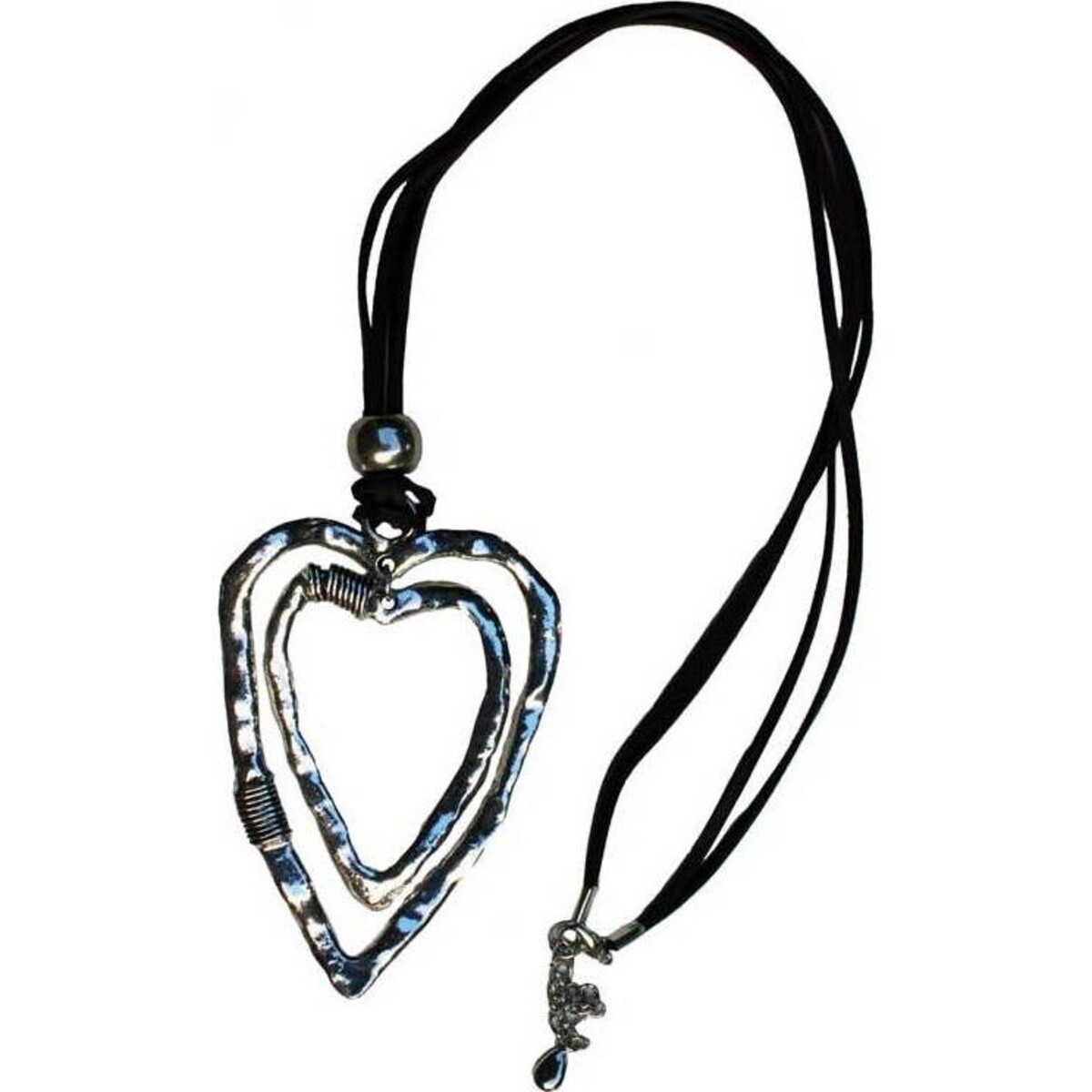 Introducing the Beaten Hearts Necklace. This fabulous piece is certainly unlike any other necklace you currently have in your jewelry box. It consists of a black cord necklace that has two flattened silver hearts - one inside of the other - hanging from it. Although this necklace is gorgeous for the way it looks, consider it a reminder as well that regardless of how much your heart gets beaten, bruised and battered over the years, it can still be beautiful.