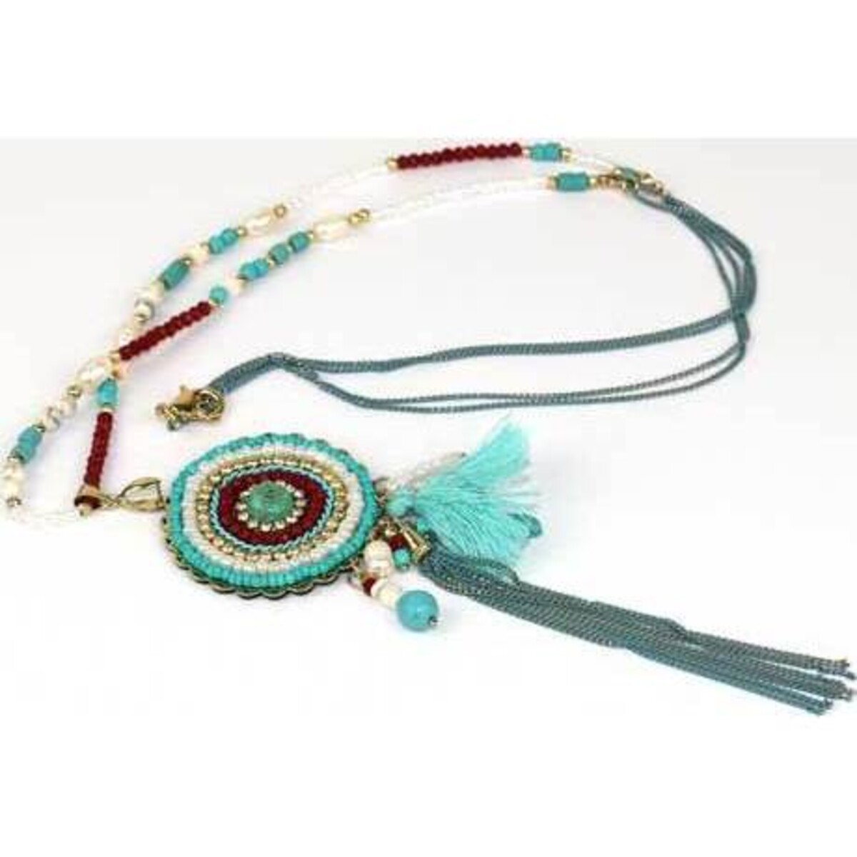 There is always something about wearing a symbol of nay culture and the dream catcher which was used for ensuring that little children sleep safe and secure even in the dream world s a rather comforting little object that makes one want to own one. Here is your chance - wear this dream catcher pendant necklace that has a cotton thread work detailing. The blue and white bead work gets more defined with the usage of maroon and the manner in which the blue thread making up the main structure of the necklace has been used makes it a cut above in its looks. The layering of threads in the dream catcher central pendant has be small and the long tassels in two different en expertly created. The short and the long tassels in two different shades of blue makes it look simply enchanting. Catch not just dreams that make you happy but also the attention of a lot of people who will appreciate this charming accessory for its authentic good looks and its expertly finished workmanship. It has a total length of 48 cm.