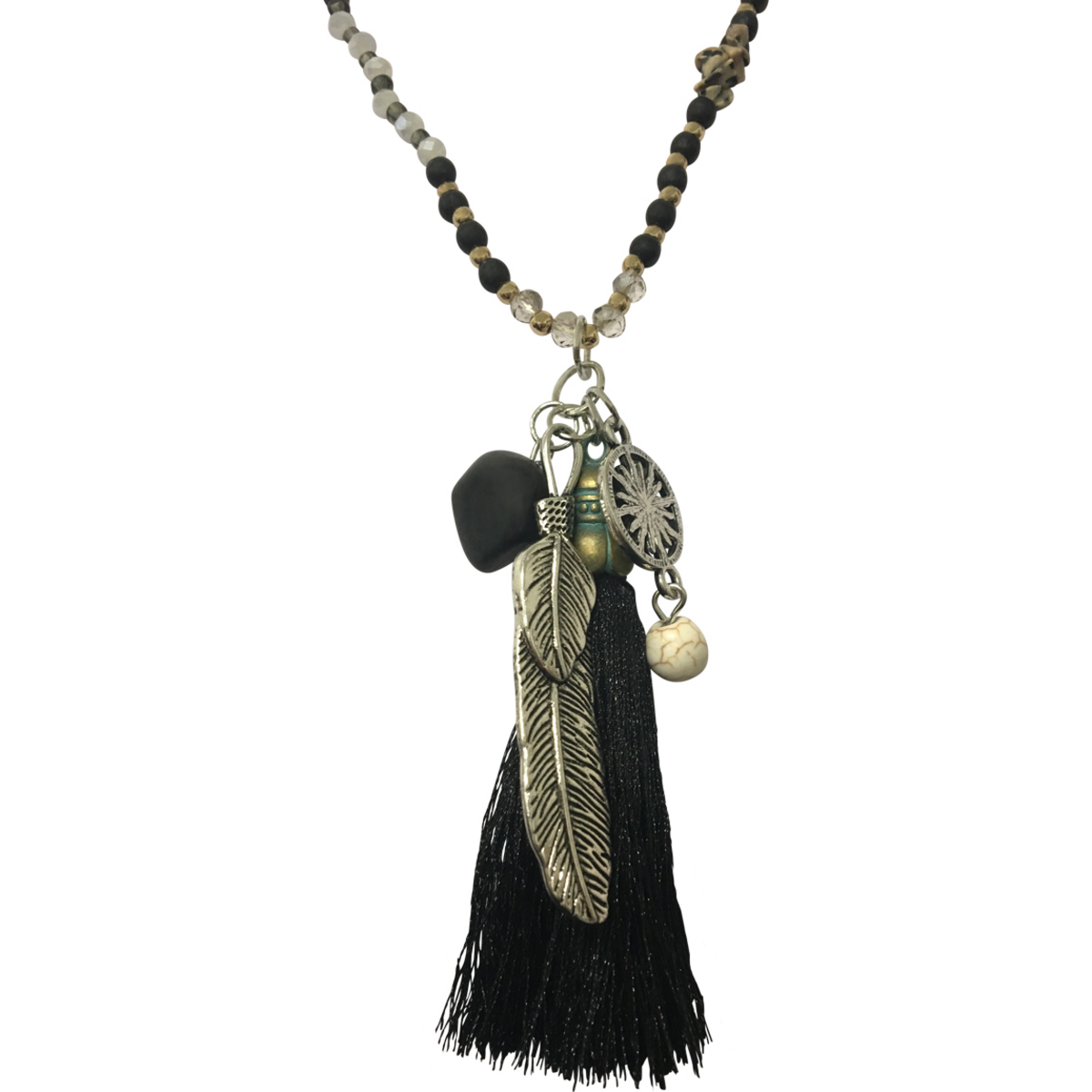 Jewellery designing has been on a journey of finding new expressions through designs that evoke traditional as well as embark on new journeys of innovative designs as and when the desire to do something new arises and this one design majorly n black and silvery metal shades is a superb. The central whorls of the pendant is a comparison close to an artwork with elements of cotton fibre in the form of a tassel, a metal with an oxidized silver look and stone beads as well as glass beads get together in a harmonious rejoicing of elements. The inspiration surely is from aborigines and American Indian jewellery that pays homage to elements of nature that govern their life and destiny and so the presence of metal, stone and feather. The kind of necklace that will be instantly noticed for its design and the details that have gone into making it so attractive. The necklace itself has alternating shades of beads with a total length of 45 cm.