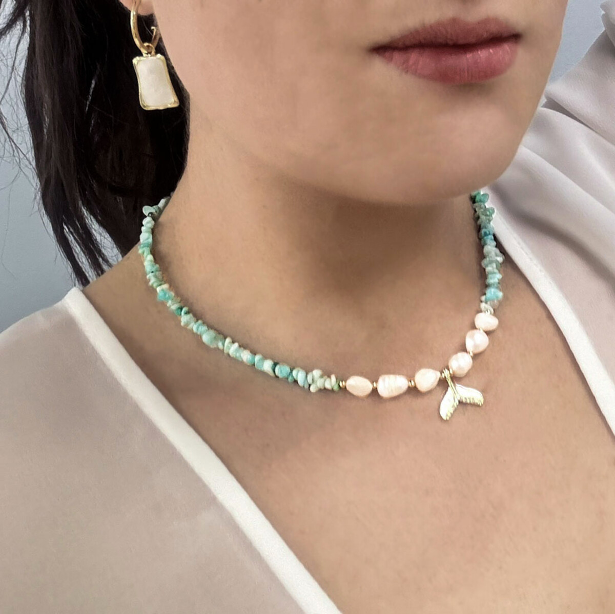 We can’t help but feel like the best pieces are often the ones that are just a little bit unexpected - and our Necklace Freshwater Pearl Marine is such a fun surprise. We love how these bright turquoise Amazonite stones, paired with freshwater pearls, give off all those salt-and-sea vibes while still looking elegant enough for dinner. This piece isn’t only a jewellery box must-have - this is one of those necklaces that draws the eye to every carefully styled corner. You’ll want to have it on display near your best-selling ceramics or those seaside scents.