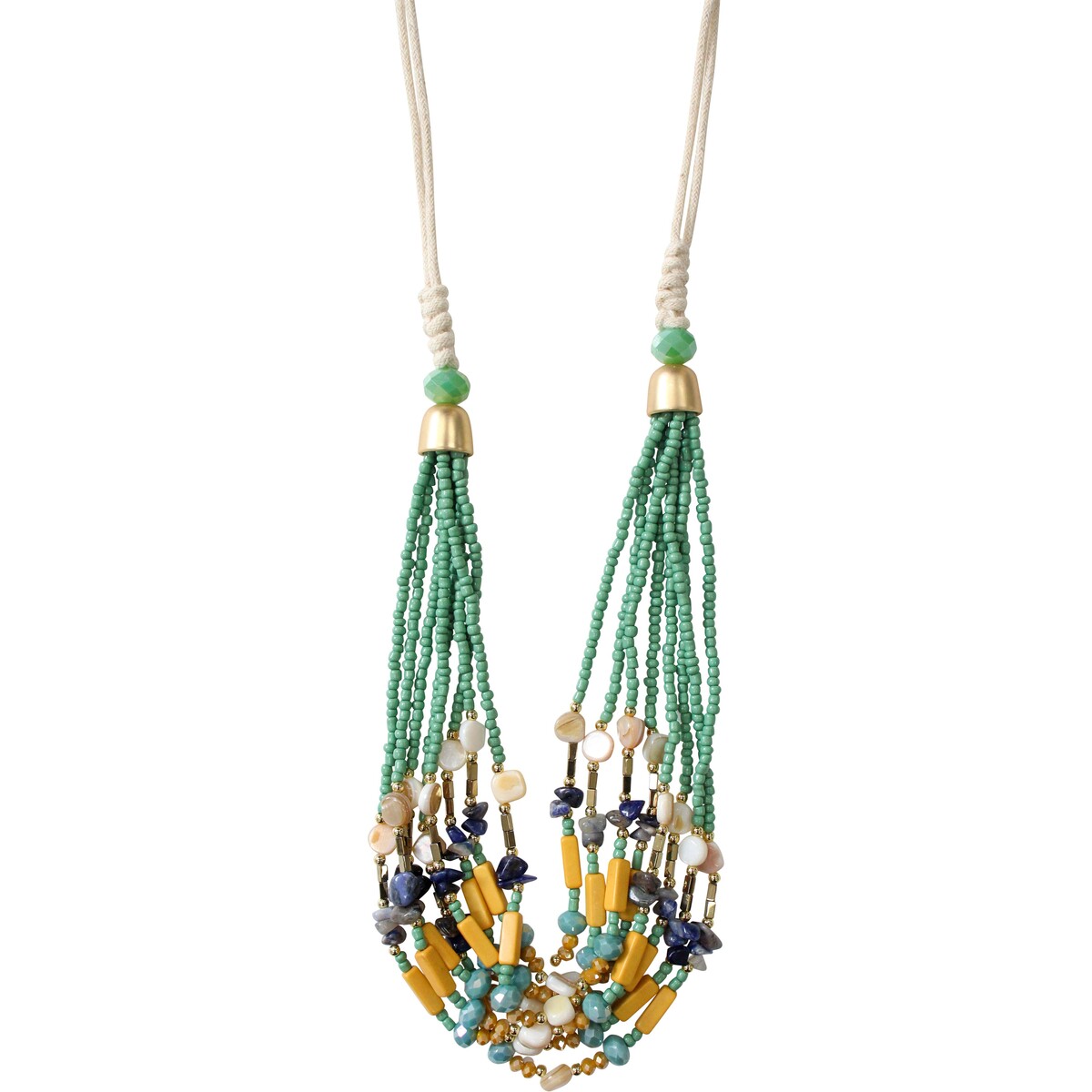 Necklace Skye is a brilliant statement piece for shops that cater to free spirits and young souls. The combination of glass and stone beads with cotton stringing gives it an earthy yet elegant appeal that works both as a casual fashion accessory and a statement necklace for minimalist formal wear. We adore the pop of fun colour throughout – it catches the light beautifully, and every piece has a subtly unique look. Necklace Skye is 80cm long, so it's quite bold but also adjustable so it doesn't get uncomfortable during all-day wear.
