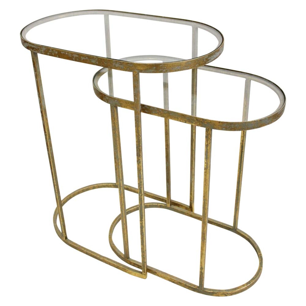 There is something about an asymmetric nesting table set like our Nest 2 Tables that draws the eye in any modern living room or luxury home office. We are not quite sure if it is the hand-finished metal frames in a vintage gold finish, the unique oval glass tops or the visually-pleasing way it fits into each other to create a fluid yet defined decor accent.