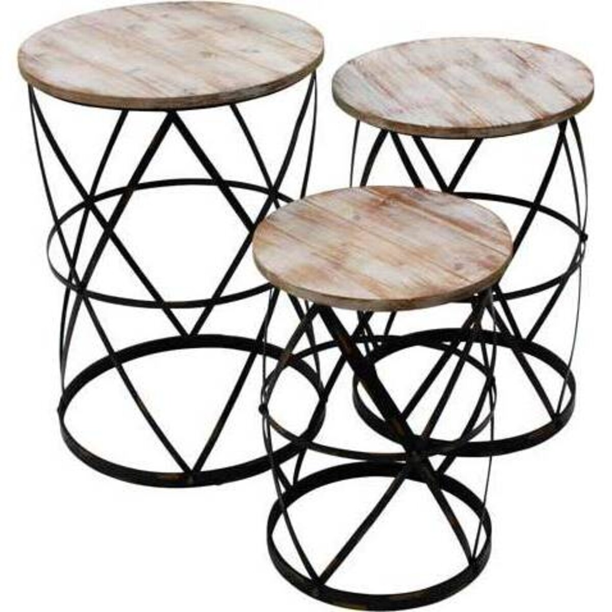 Nest of Tables Classic Band S/3 consists of a set of three tables, with the large one measuring 48x48x67 cm, medium one, 42x42x59 cm and small one, 36x36x51 cm. The top section is made of appealing wood whereas their sides feature a pattern that is encompassed both at the base and mid - section with circular ring. The tops are finely - polished, affording them an exotic form that creates good contrast with the underlying metallic framework. Use of metal makes this table - set firm and compatible with various elements of interior and exterior design for a given room.