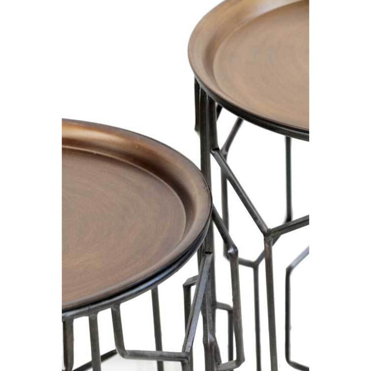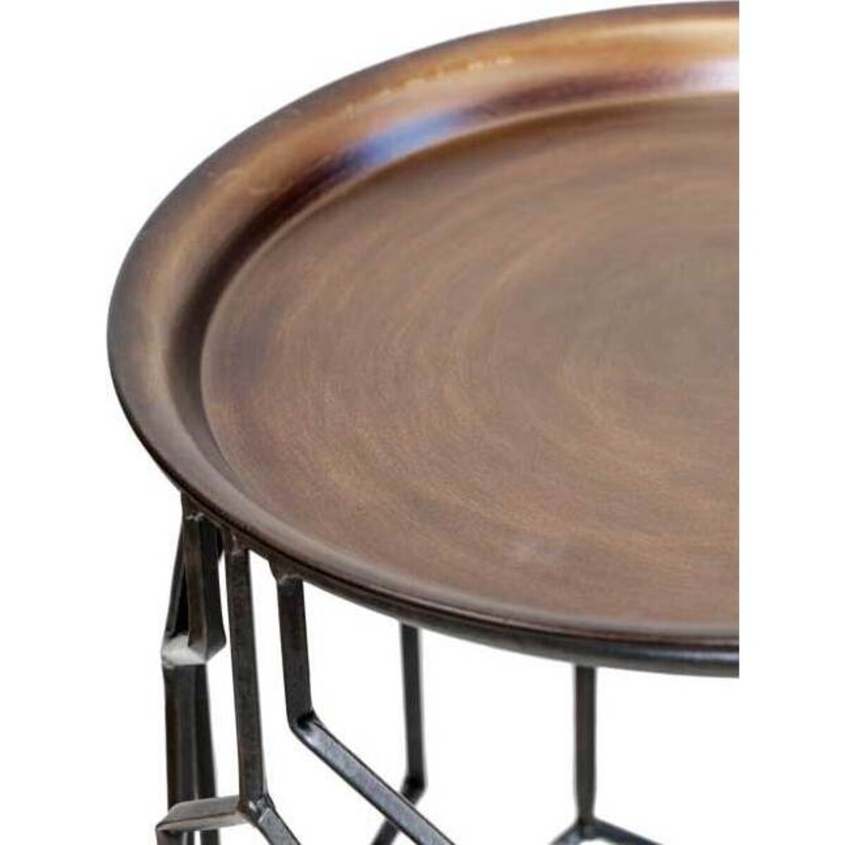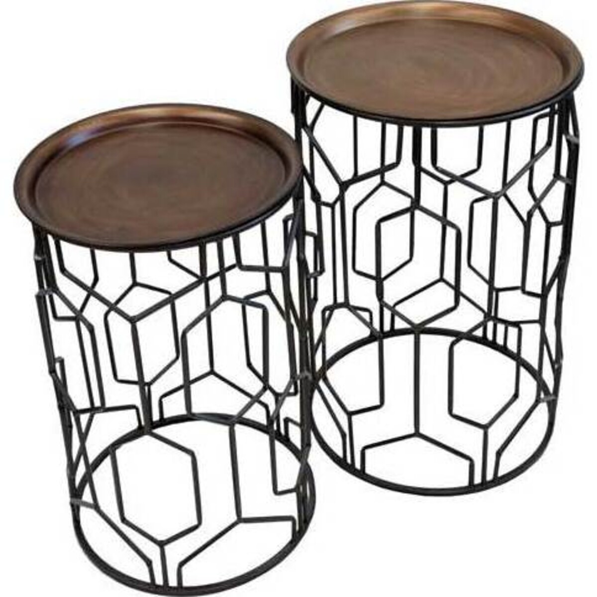The two table set has round table tops that is copper coloured making it a rather rich colour palette wherever it is placed. The frame of the table is sturdy with an intricate pattern to support its top. It balances well on the round ring that makes up its base. The taller table is 69 cm in height with a round top of 45 cm. The geometric lines of the design somehow collude together to create a very charming illusion that will be appreciated for its detailing. Moreover it is a unique set because of its rich copper colour, its usability around the house and the manner in which it can be stored with ease when not in use. A boon for modern homes that are always looking for furniture pieces to save on space. Could be used out in the patio, in the children/s room or in the sitting room when some extra guests over would mean some more extra tables and what a better way to extend the table top space than this.