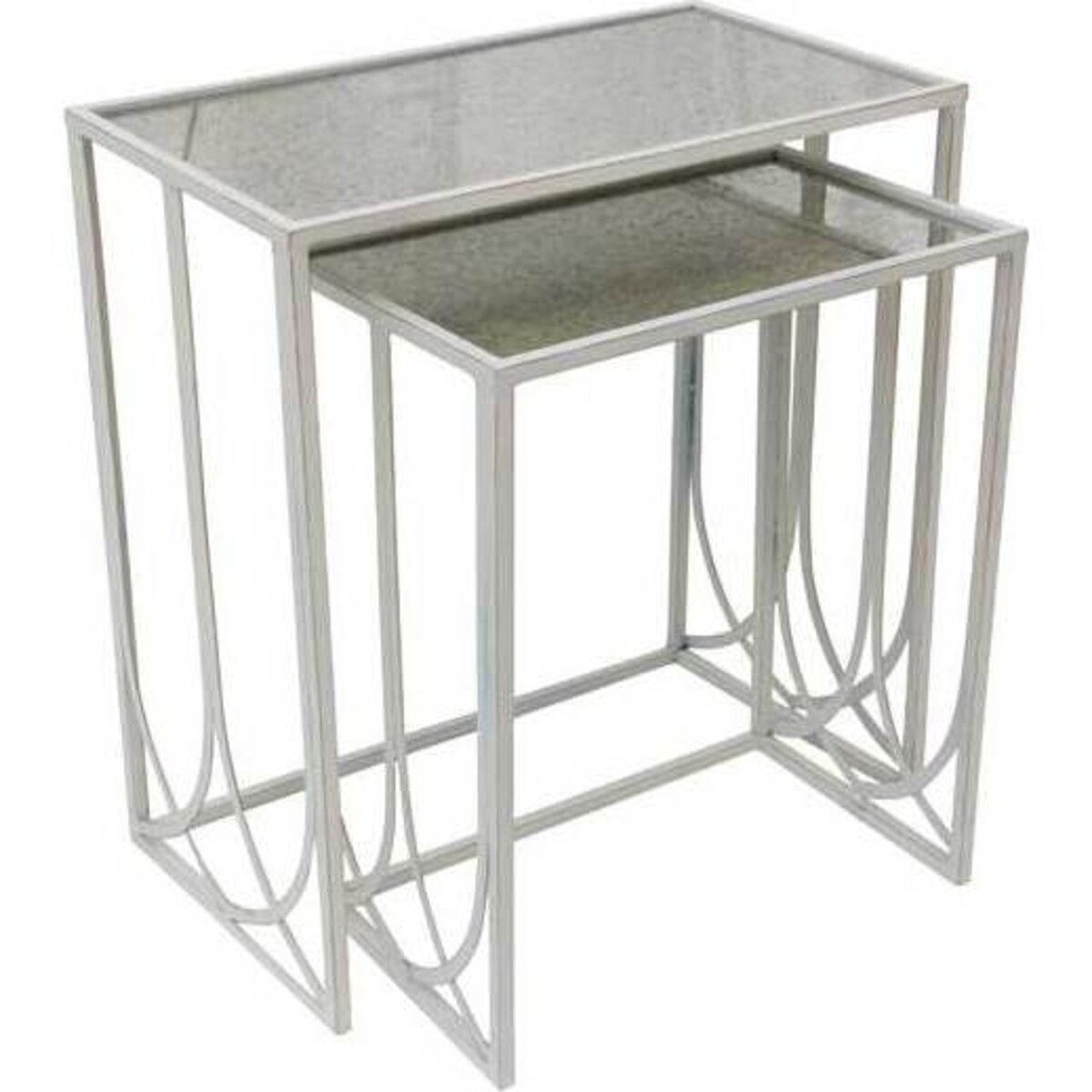 This goldline set of nesting tables includes a taller table which is as high as 63 cm and the shorter one at 50 cm height. Their size is classically like any small side table that can be used by the seating area or used for tiered display of plants or other decor item that need that little space to highlight their beauty. The tables are made of superior quality metal and the top has been given a fine finish that is not too shiny but elegantly matte. The smaller table nestles perfectly under the larger one when not in use. Also the metal legs are designed to withstand enough weight - so as far as hardiness is concerned there should be no doubt at all. In fact the arched design of the legs are so charming that they will blend in with ornate or rustic setting with equal ease. These tables in fact because of their utterly useful size will find tremendous use in the household. The rectangular top also allows easy placement in corners.
