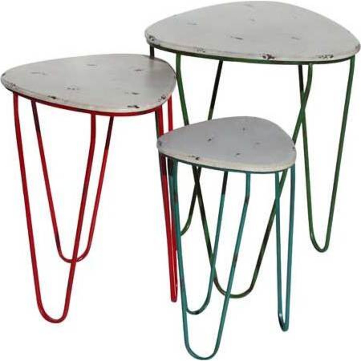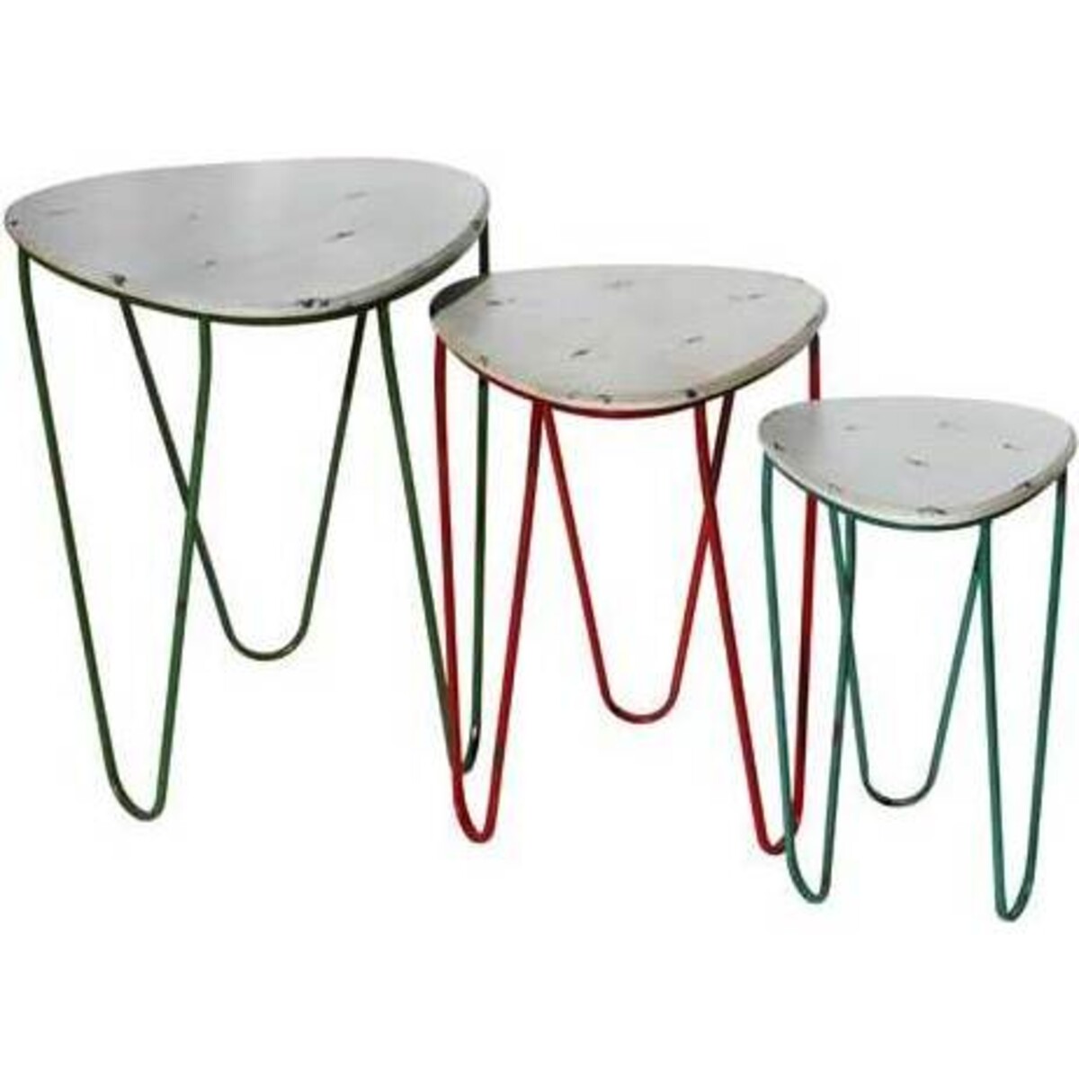 This set of nesting tables come with a very contemporary design made with wood and metal in a uniquely simple design that goes well with all modern settings that are non - fuss and extremely utilitarian. Those who like minimalistic looks and are fans of shabby chic vintage look will find the distressed paint finish of the table top quite interestingly different. The tables are sized in a way that they can be kept in any nook, fitting under each other with great perfection and thus saving on space when idling. Each of the sizes are compact yet usable for outdoors or the indoors, maybe in the children's room or when it is the garden where you would like to spend a glorious summer morning. Because of its light weight and its clean good look, this design will blend in with perfection as much in the outdoors as inside the house. Each of the tables come with loop shaped legs that are very stable and come in three distinct colours to give it a cheerful fun look.