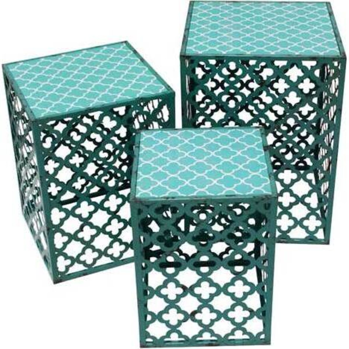 Nest of Tables Quatrefoil Square S/3 comprises a set of three tables of rectangular shape. They are made of metal and glass in stylish fashion. The sides exhibit tasteful patterns while the top parts appear distinct due to use of white stripes for the continuous pattern, leading to a consummate piece of furnishing overall. The measurements for this set are 43x43x60 cm for the large one, 38x38x52 cm for the medium one and 33x33x45 cm for the small table. Buyers can consider acquiring this enticing set of furniture for use either indoors within their homes or at offices and even gardens.