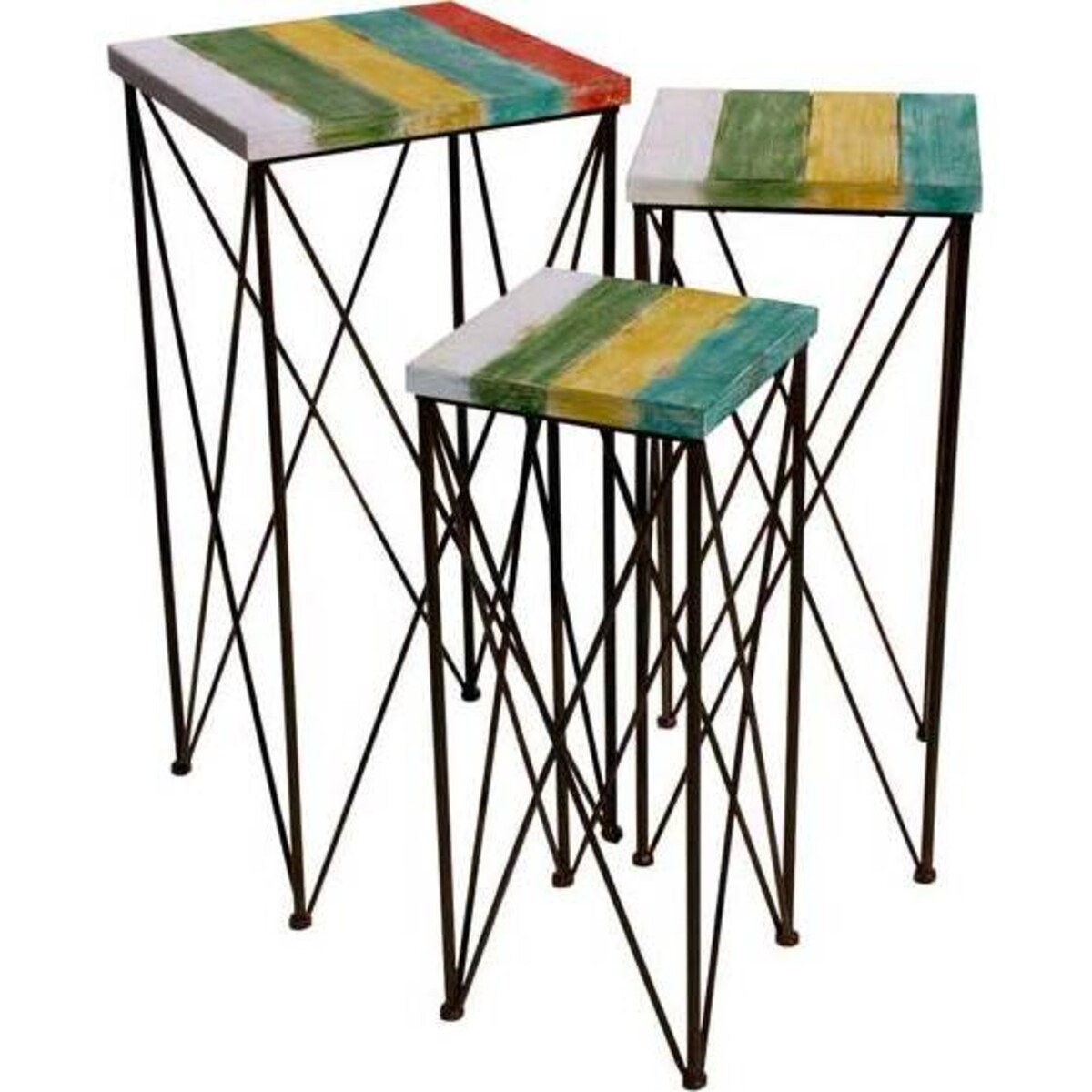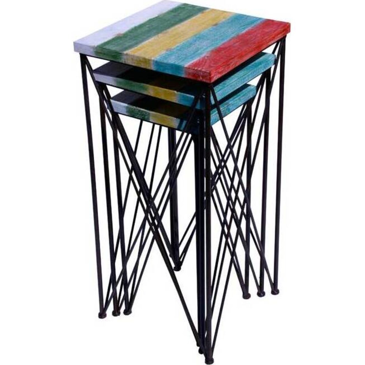 Post - modern furniture styles have been high on functionality and equally high on no - fuss good looks. This combination can be seen to great effect in this set of three nesting tables. Each of the tables will in their own special way accommodate displays and look fabulous on their own as well. The nesting character allows one to place then in any part of the home. It can be placed in a small nook of the house when not in use. The sizes vary and that gives it more flexible usage. The tallest one is almost 2 feet high and the shorter ones just a couple of cms less. The top of the tables have gorgeous coloured stripes that makes the table look vibrant. It helps fill the space where it is placed with a certain amount of modern style in tune with the shabby chic look. Convincingly modern yet in a classic style that will converge wonderfully with different decor styles. The tables will be as useful indoors as it would be outside the confines of the house.