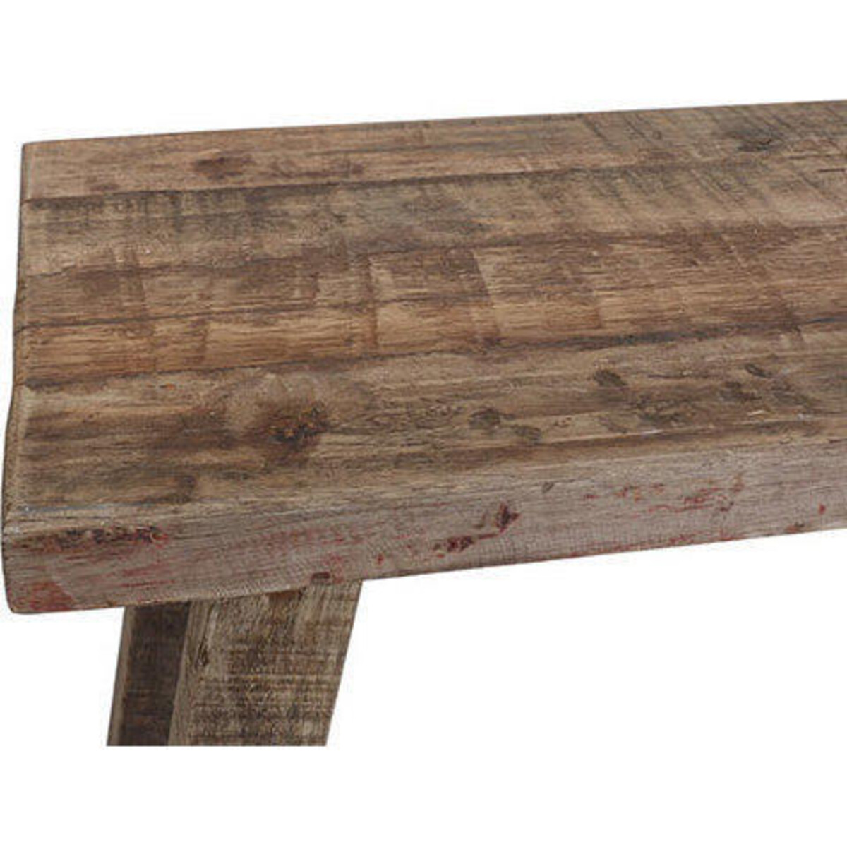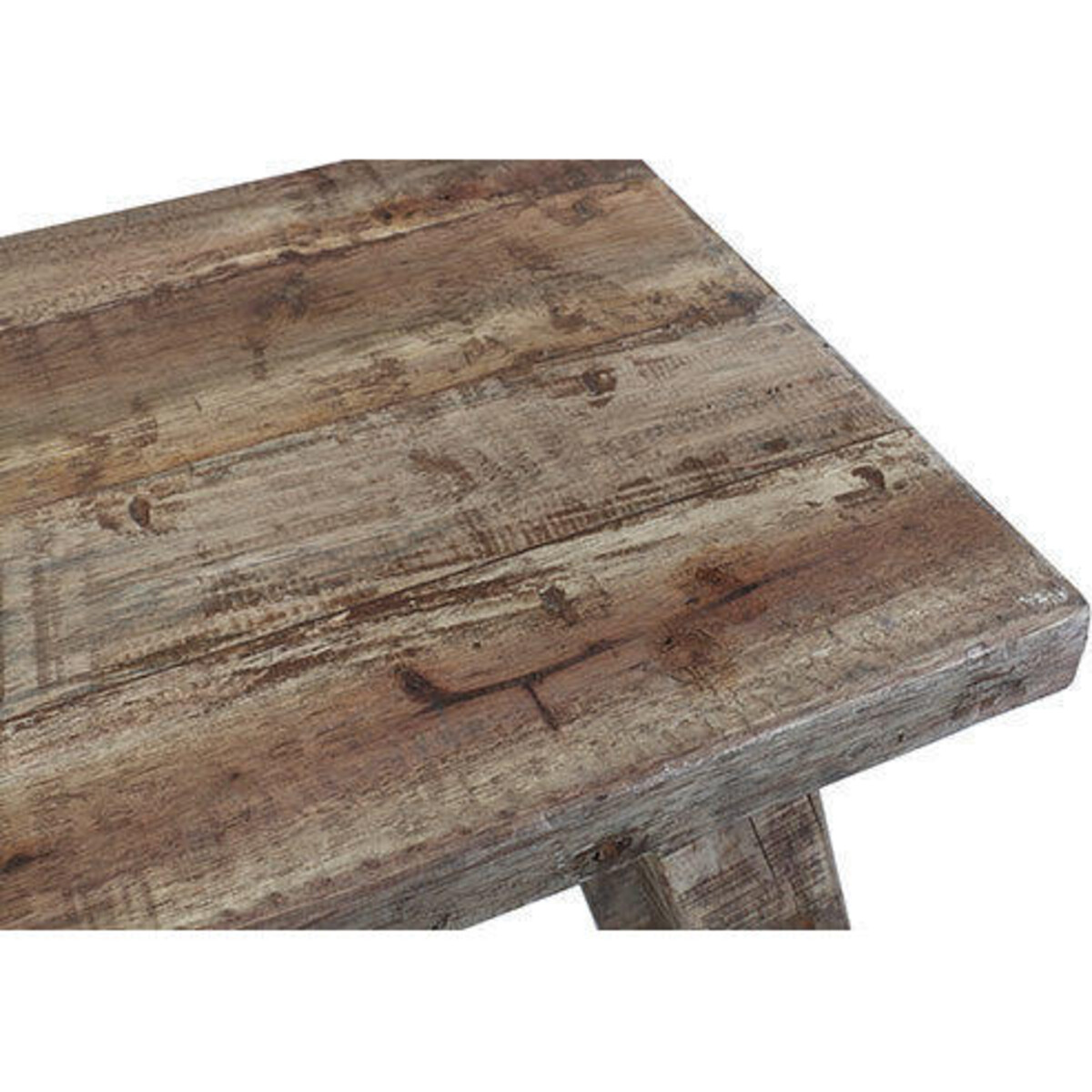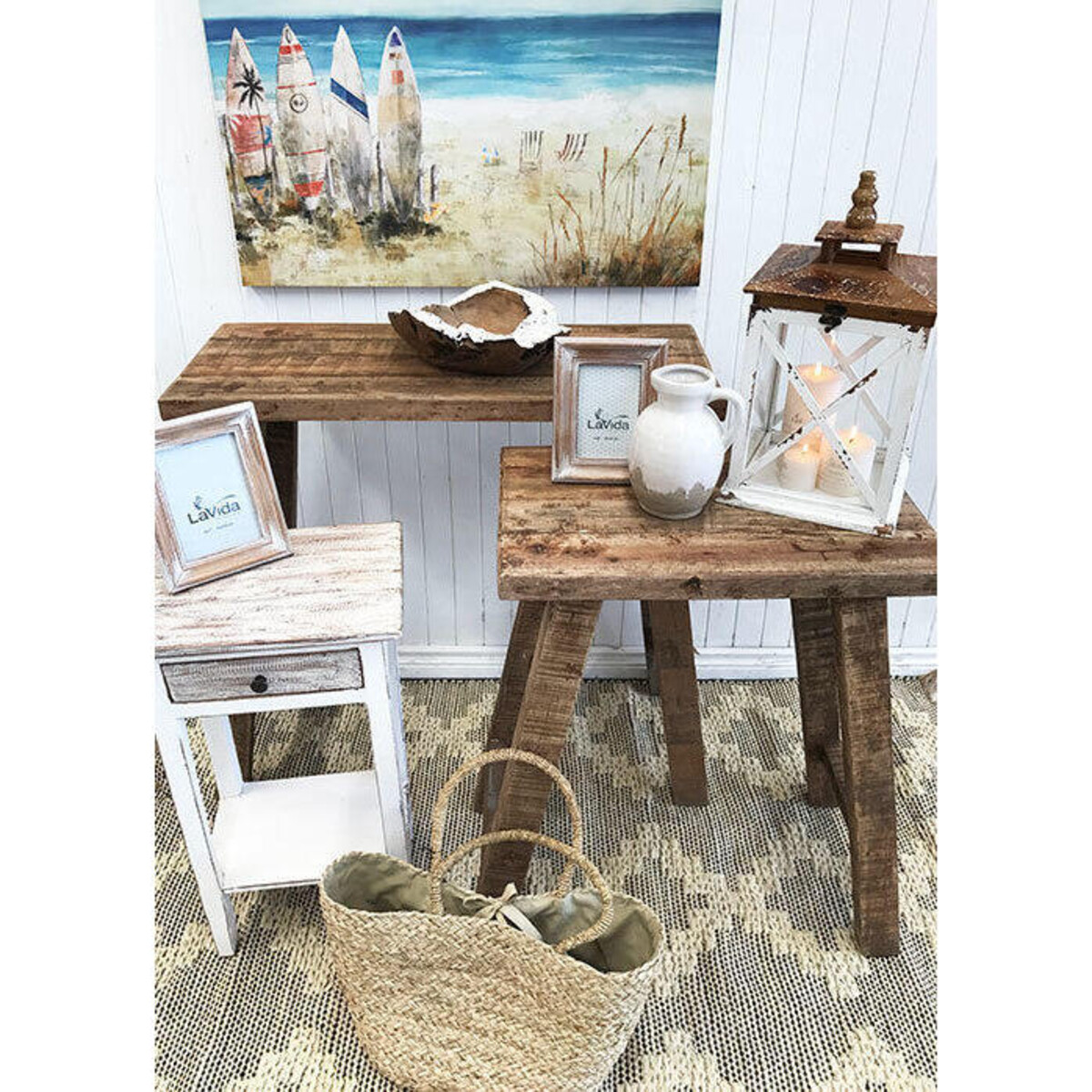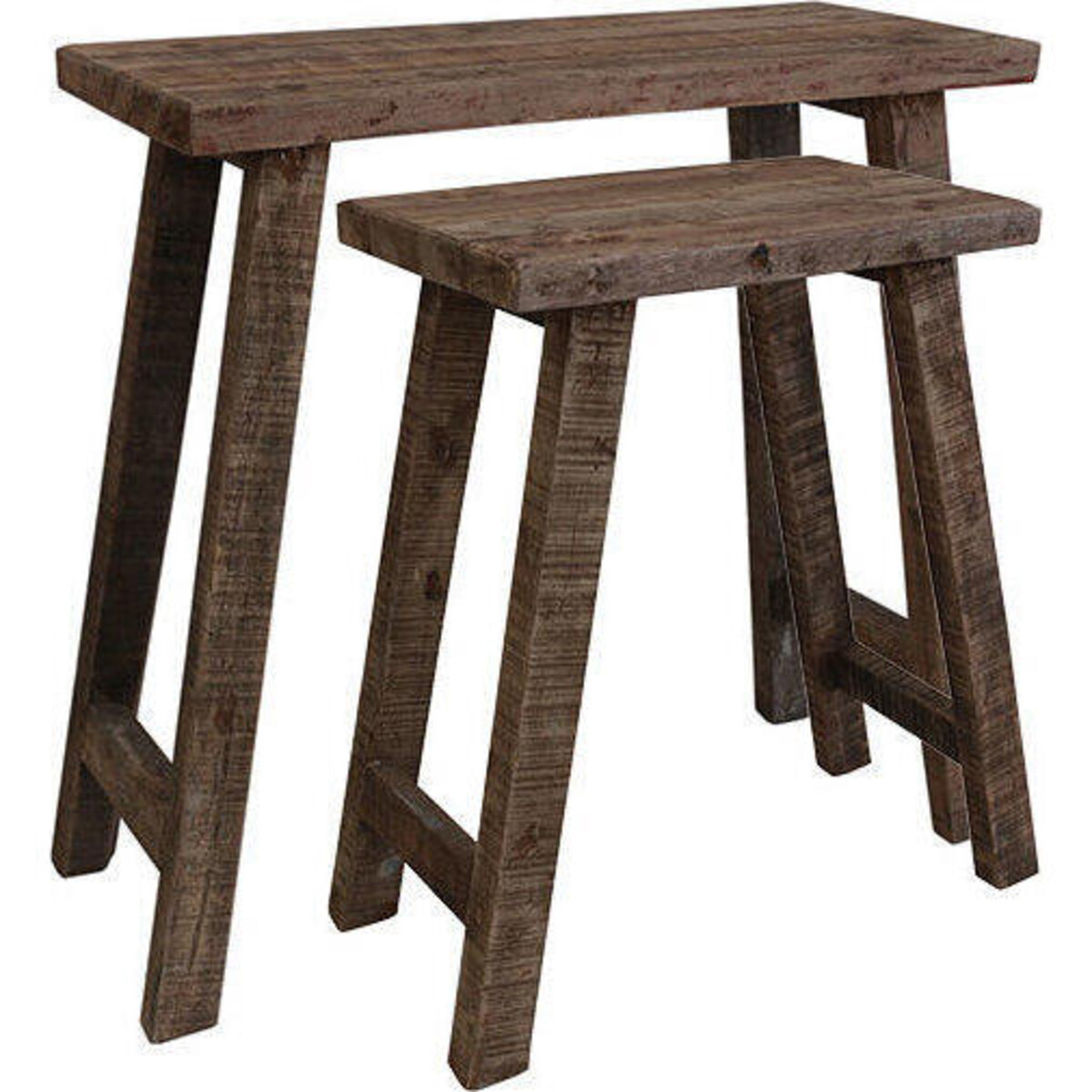 Nesting tables are a great boon to have around the house as they get into so many areas of utility, be it for setting up the décor-in the outdoors to create more table top spaces or simply as a multipurpose table anywhere in the house. This set has two tables made from rugged weathered reclaimed wood and it bears the marks of its age rather handsomely. The dark hued wood is solid and since it has seen much time it will be perfect for use in the outdoors ready for the bad weather as well. The nesting quality allows it to be stacked and kept rather easily. It has s simple design with slanting legs and no embellishment on the top or the base and thus its avid rusticity is rather pleasing. Would go famously with shabby chic setting and will add a dimension of plain solidity to your setting. Easy to move and place, very versatile and simple in looks to help blend it on with all kinds of spaces. The larger one has height of 90 cm while the shorted=r one is about 60 cm in height allowing the smaller one to fit under the larger one easily.
