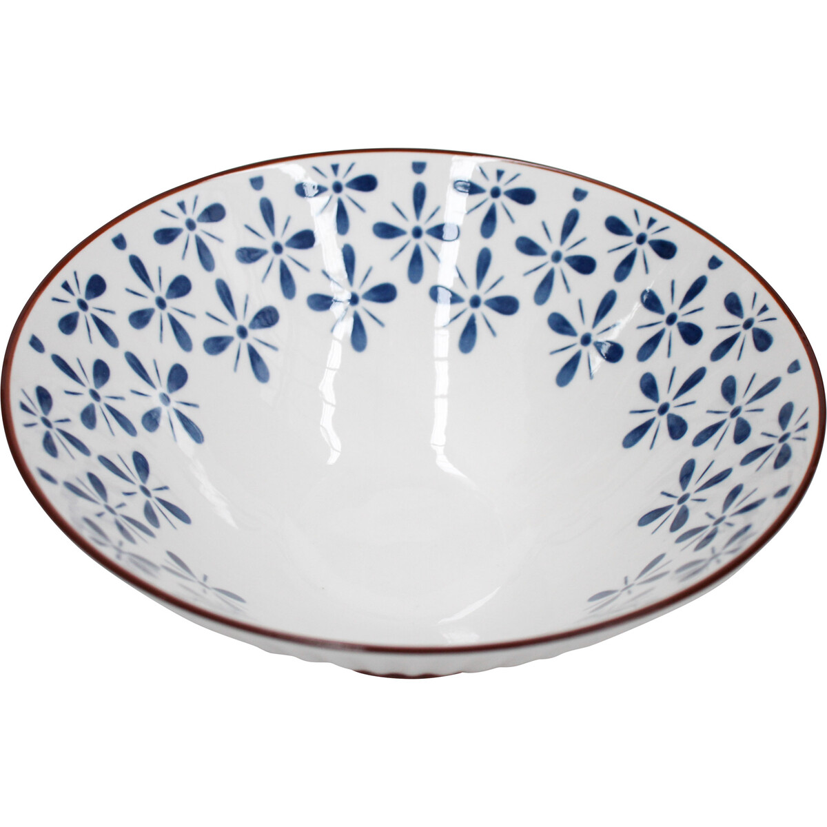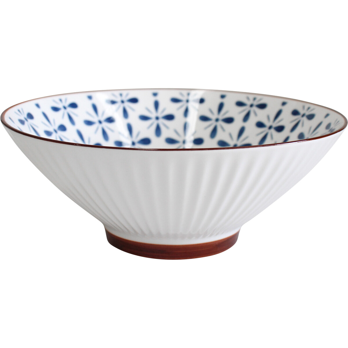 The Noodle Bowl Motif elevates the dining experience with its timeless white base, delicately adorned with a traditional blue floral pattern that encircles the interior rim, offering a classic aesthetic that will complement and enhance a range of home or office decor. The subtle ridges on the external surface add texture and sophistication, culminating in a rich brown trim that accentuates its contours, providing a harmonious balance of colour and design.