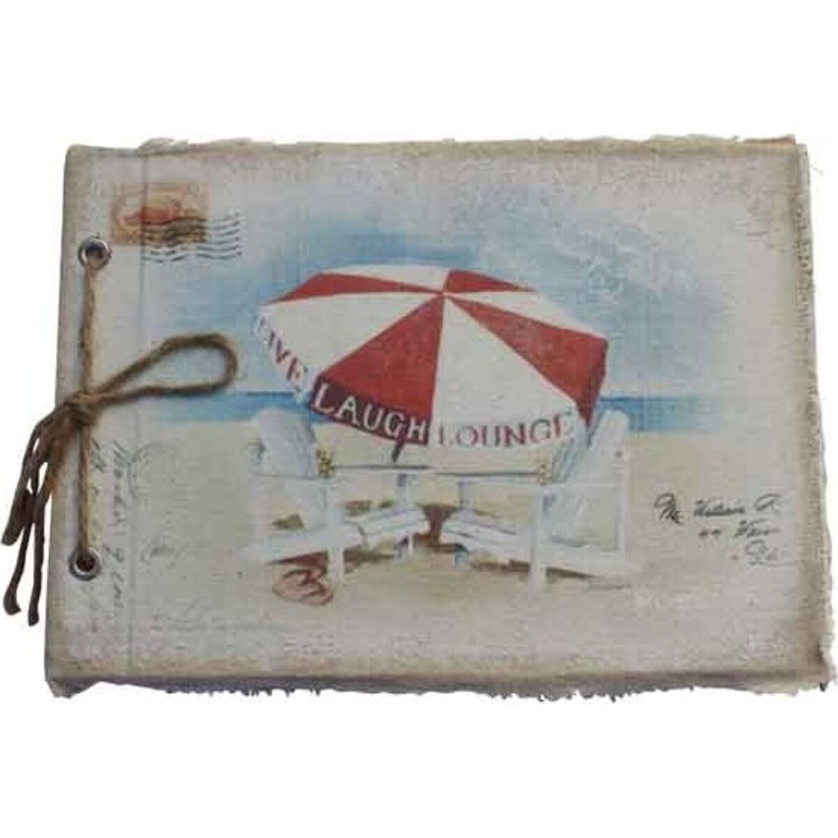 The bright red and white beach umbrella combined with classic pristine lounge chairs are featured at the front. The worn out effect adds a charming detail, while the laid back colour allows this notebook to be suitable for both men and women.