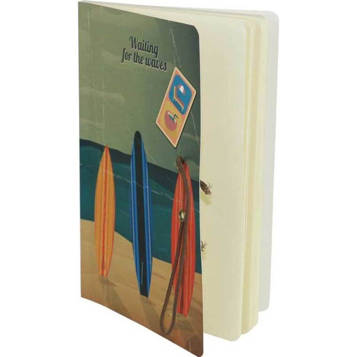 Everyday life is no holiday but if things that we use possess a certain zestful image and colour it can help make the mood lighter-like this well designed and graphically perfect notebook that will instantly bring a smile on one's face with its picture perfect cover design. The three surfboards seem to be waiting in anticipation for the fun times to roll in with the waves. On days when taking notes and sitting in a lecture hall seems to be the last thing on one's mind-this cover can help one drift away to the land of happy times. The three surfboards seem to be looking out at the approaching surf-a feeling of hope and expectation is there right across the notebook. The binding, the print on the cover and the closing strap to help keep the pages damage free are all other features that work wonderfully for this notebook.