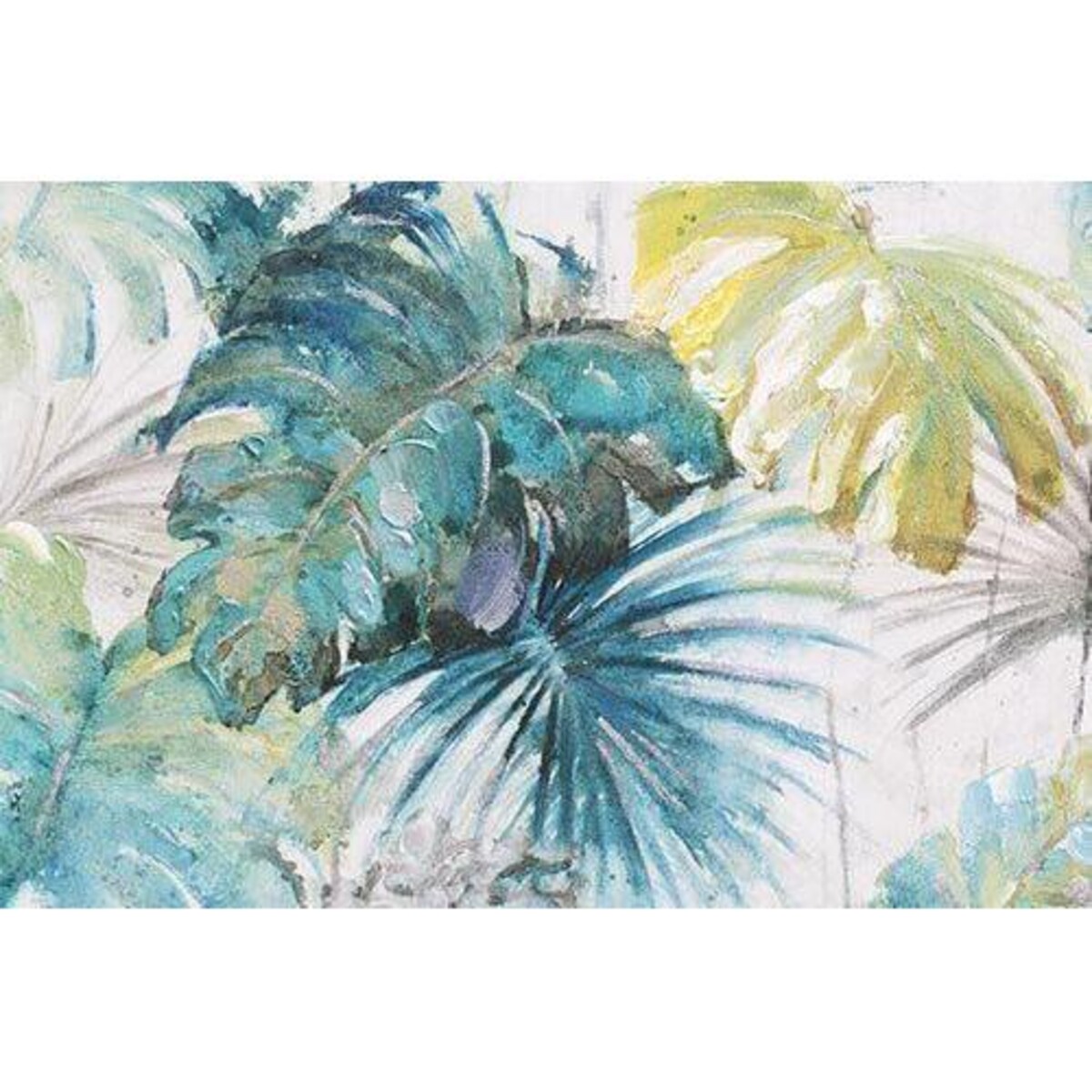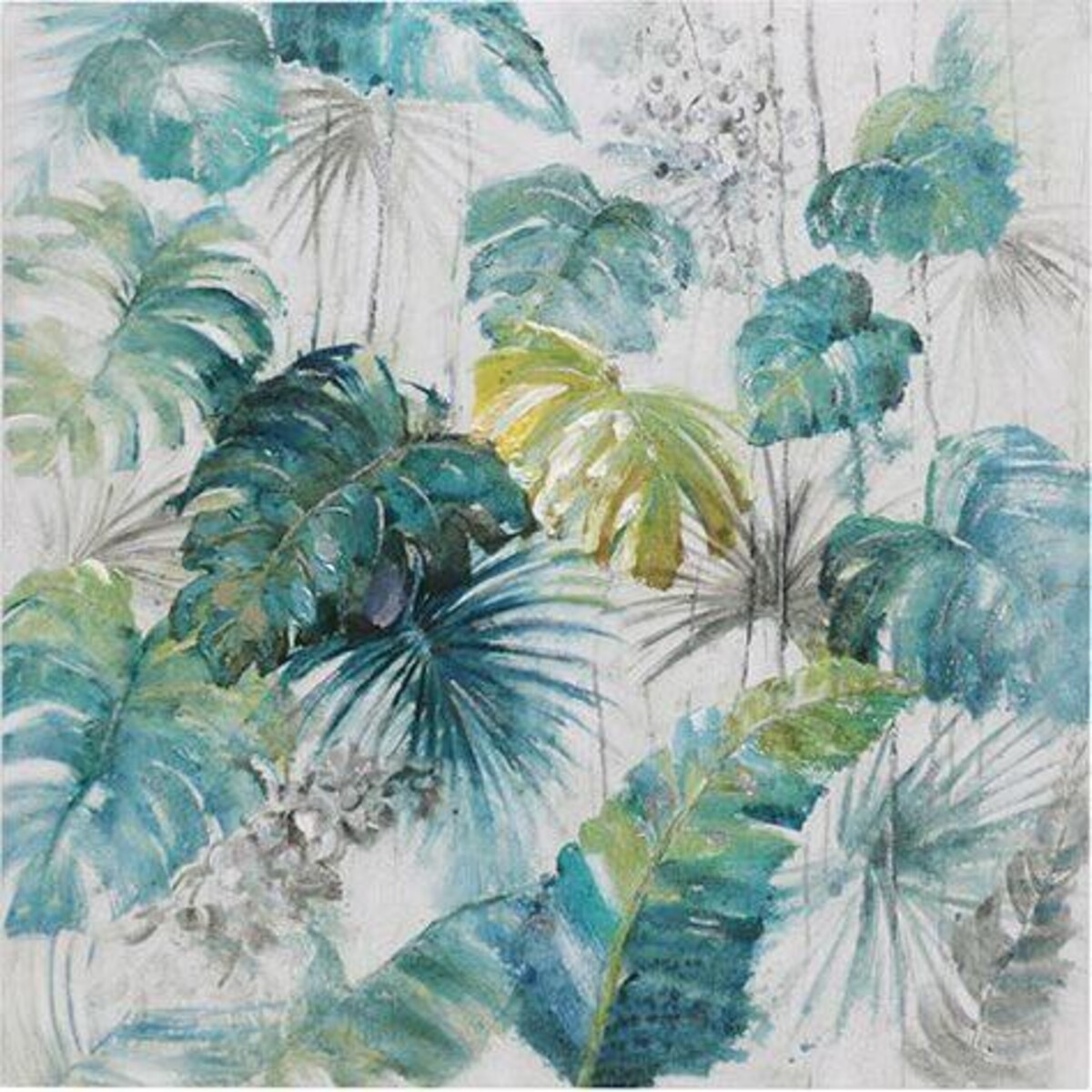 This square canvas is 100 cm in height and 100 in width and thus with its size and proportions shall dominate the wall. The varieties of greens explored on the backdrop of paleness makes the detailing all the more riveting and hypnotic in its beauty. The tropical forest is perhaps the liveliest place to depict - filled with the clamoring for more - glossy leaves, new born struggling their way up from the undergrowth that us dense, broad and handsome foliar structures in palms and monsterias, abjectly healthy and forever filled with life. Add that stupendous beauty of where life truly resides on your walls and make the greens apart of the décor. The artist has played around as much with depth as with form and colour using a masked way of conveying the beauty nature through merely a description of leaves. Understated, but not the kind that can be ignored, owing much to its vividness and detailing.