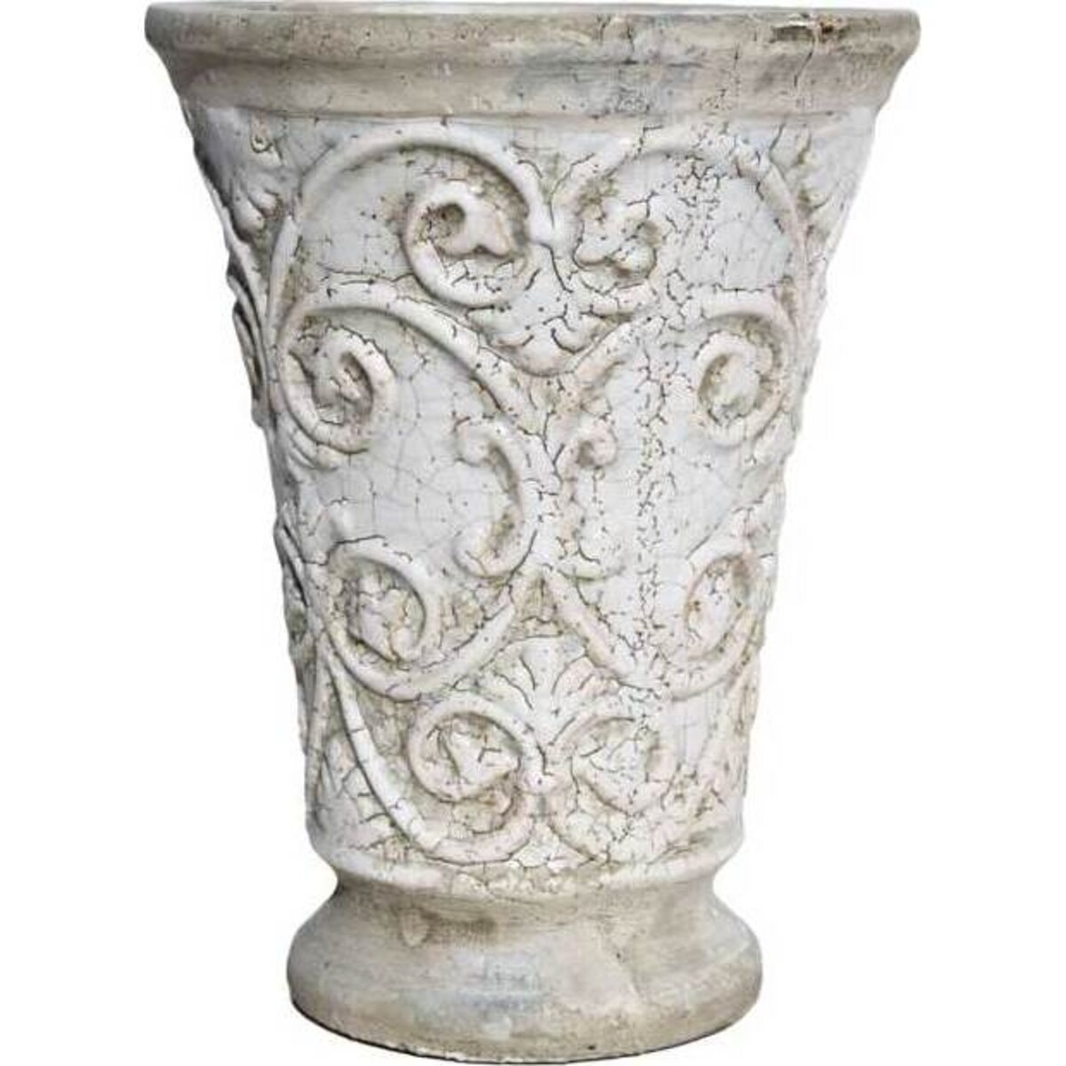 This fabulous piece consists of a gray and white stone facade that features an embellished swirl pattern. What really makes this piece stand out is the cracked and worn appearance, which gives it a look as if it's been well loved for years but still has enough charm left in it to last forever. You'll adore displaying this vase in your home wherever you can see it on a daily basis.